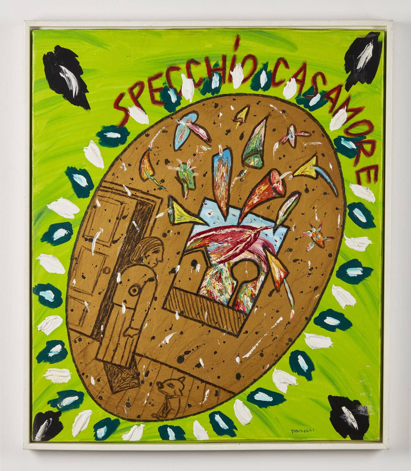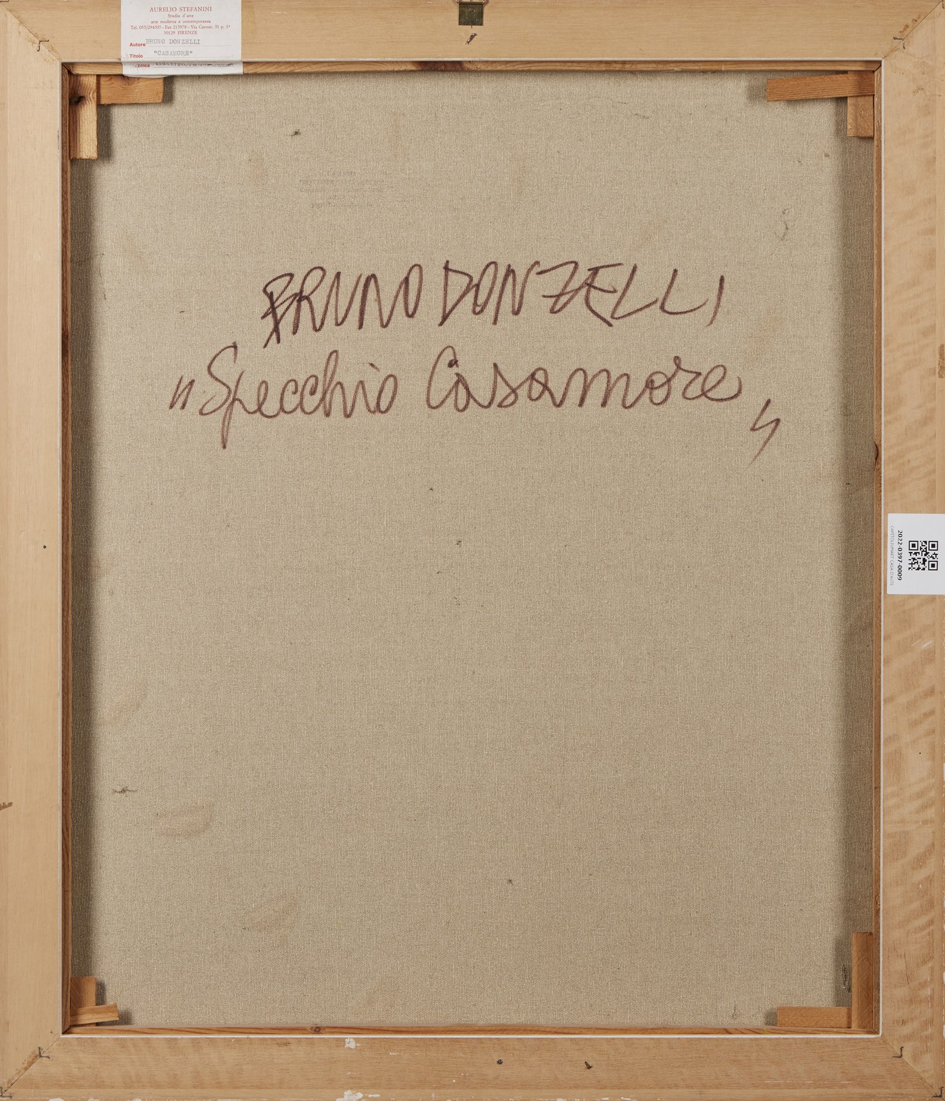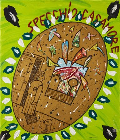 DONZELLI BRUNO (n. 1941) Specchio Casamore. Tecnica mista su tela. Cm 40,00 x 70,00. Titolo in alto al centro, firma in basso a destra. Al retro titolo, firma e cartiglio Studio d'arte Aurelio Stefanini, Firenze. Autentica dell'artista su fotografia. Cornice presente