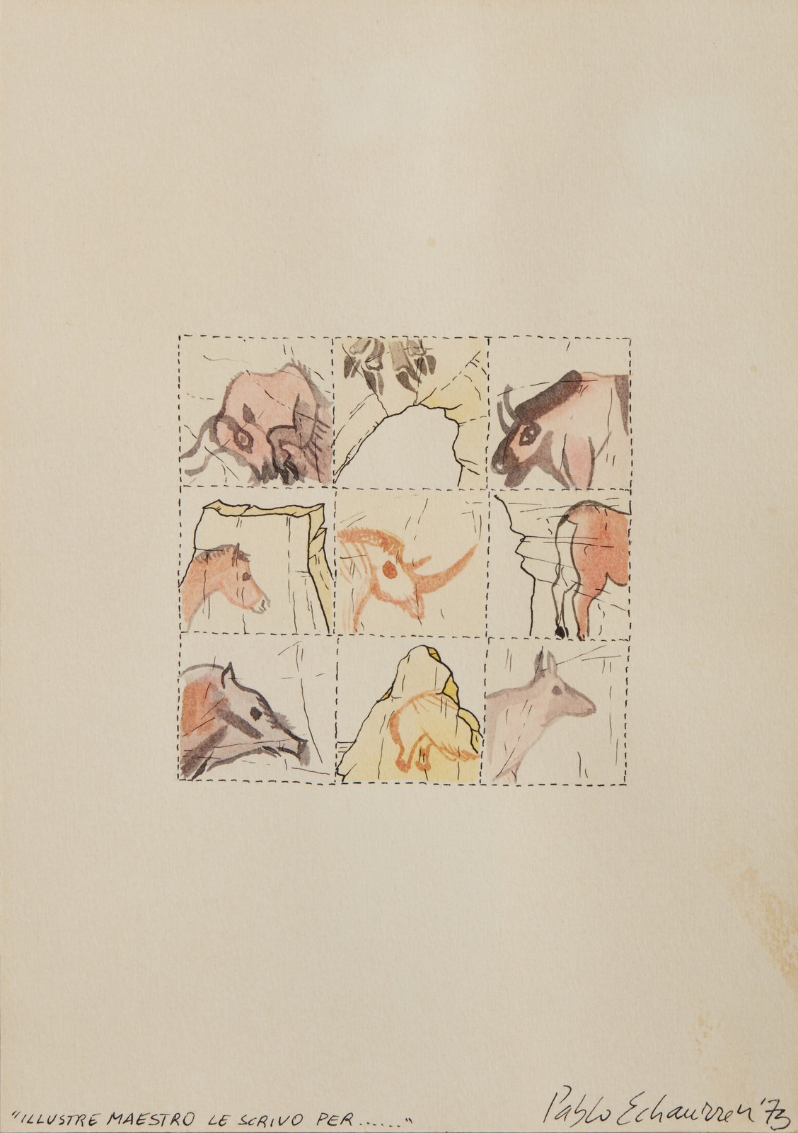 ECHAURREN PABLO (n. 1951) "llustre maestro le scrivo per...". 1973. mista su carta. Cm 16,00 x 23,00. Firma, titolo e anno in basso a penna. Lievi difetti. . Cornice presente