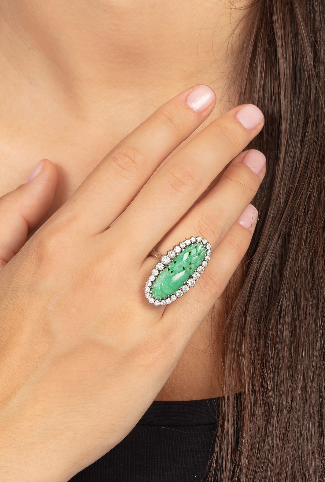 Lotto 218 | Anello con giada incisa e diamanti a contorno