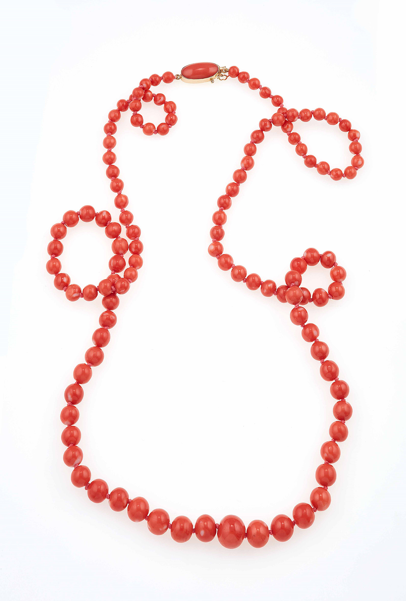 Collana lunga con boules di corallo, fermezza in oro giallo 750/1000, gr. 43,1