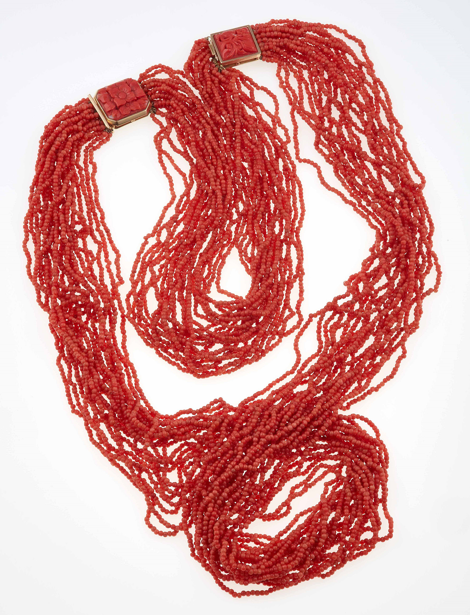 Sautoir a più fili, composto da micro coralli con due fermezze di corallo intagliato, divisibile in due collane. Fermezze in oro giallo 750/1000, gr 245, cm 120x2.5 , 20 fili con boules da 2.57 mm ca.