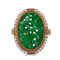 Anello con pietra dura tinta di verde, perline e smalti policromi, montatura in oro giallo 750/1000, gr. 8,4, misura italiana 19
