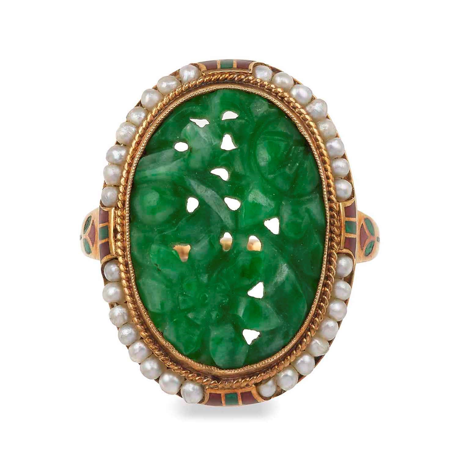 Lotto 297 | Anello con pietra dura tinta di verde, perline e smalti policromi