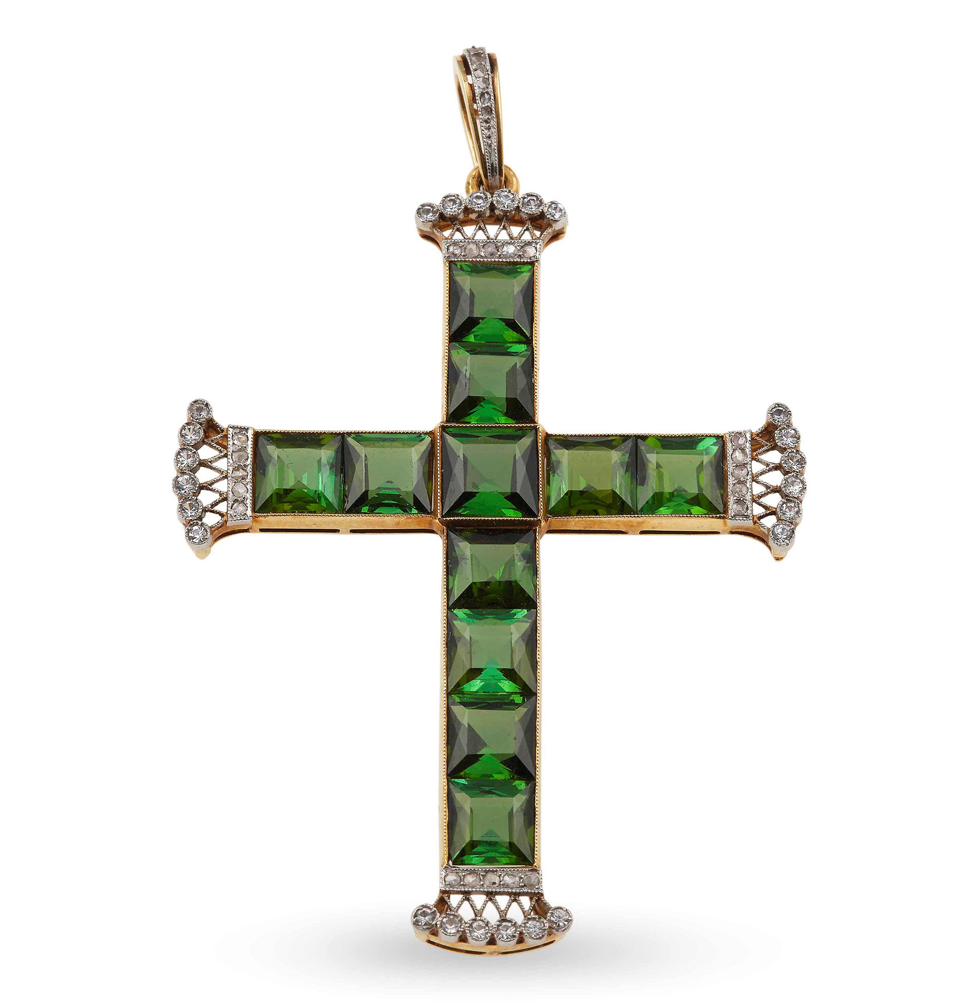 Pendente con tormaline verdi e piccoli diamanti, montatura in oro giallo 750/1000, gr 18,3, cm 8 x 5