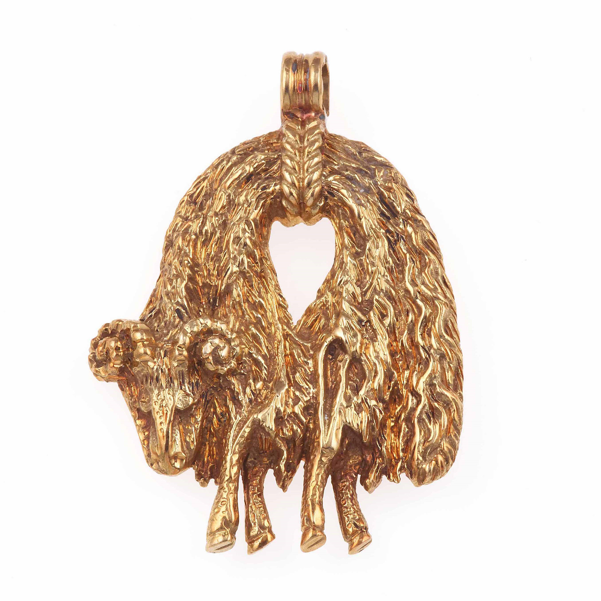 Pendente "toson d'oro" (citazione), oro giallo punzonato 585, gr 24,7, cm 4 x 3