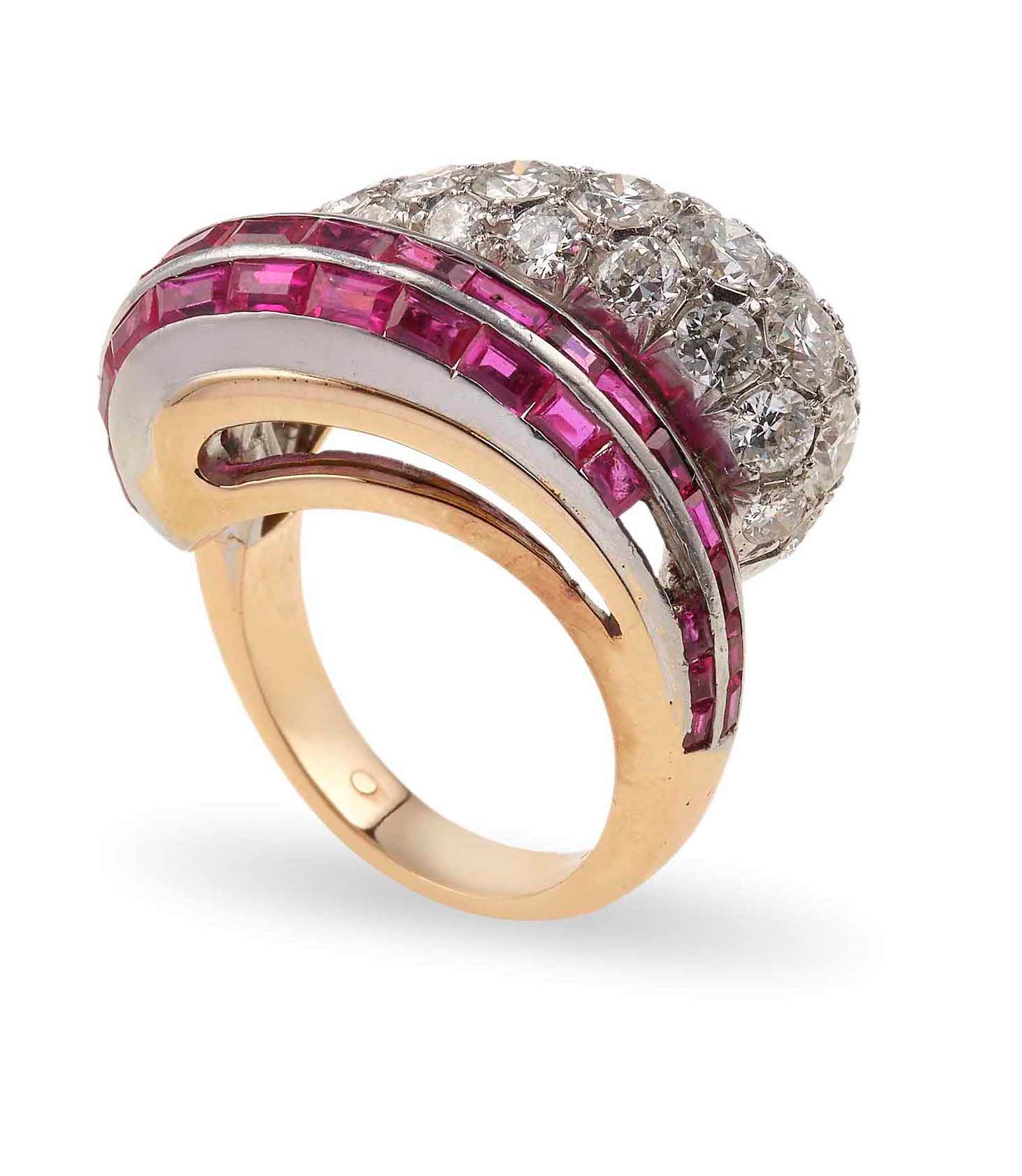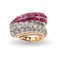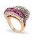 Anello con rubini e diamanti, montatura in oro giallo ed oro bianco 750/1000, gr 17,0, misura italiana 13