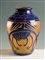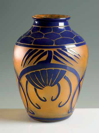 Le Verre Français. Lampada da tavolo in vetro a cammeo con decori vegetali stilizzati in arancione e blu su fondo giallo, 1925 circa. Firma incisa: Le verre français altezza cm 35