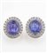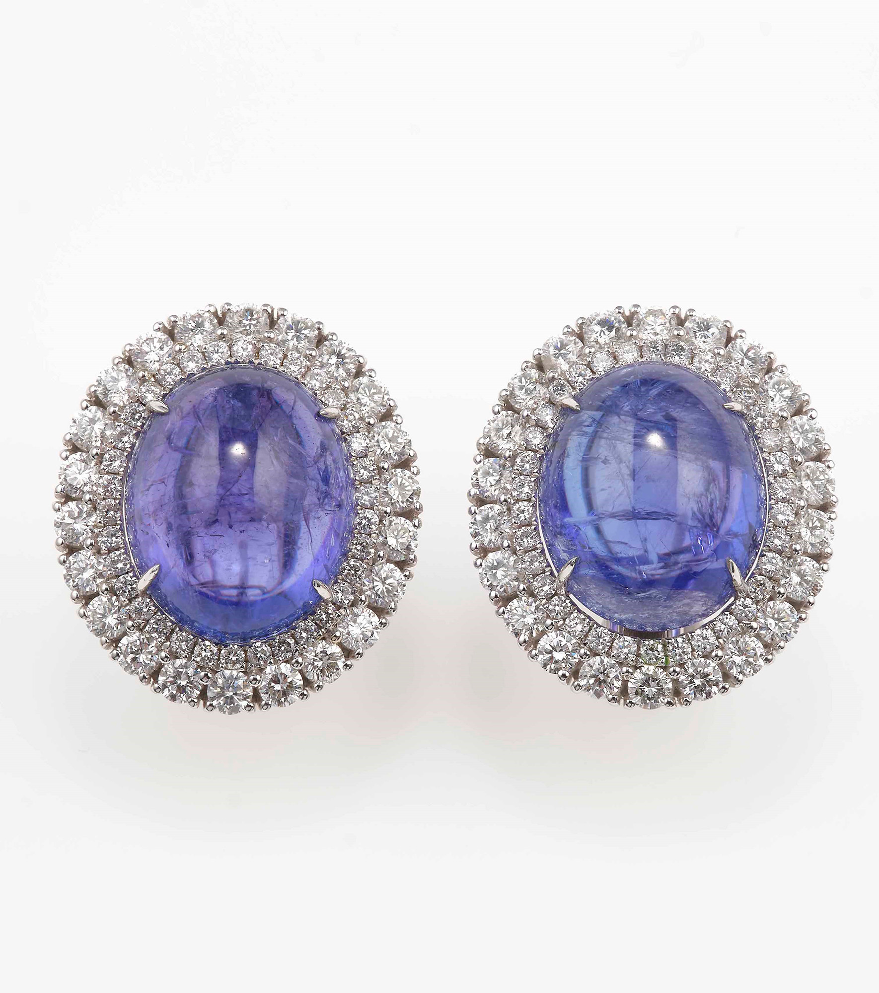 Orecchini con tanzaniti taglio cabochon e diamanti a contorno, montatura in oro bianco 750/1000, clip con perno, gr totali 16,3, cm 2,3 x 2,0