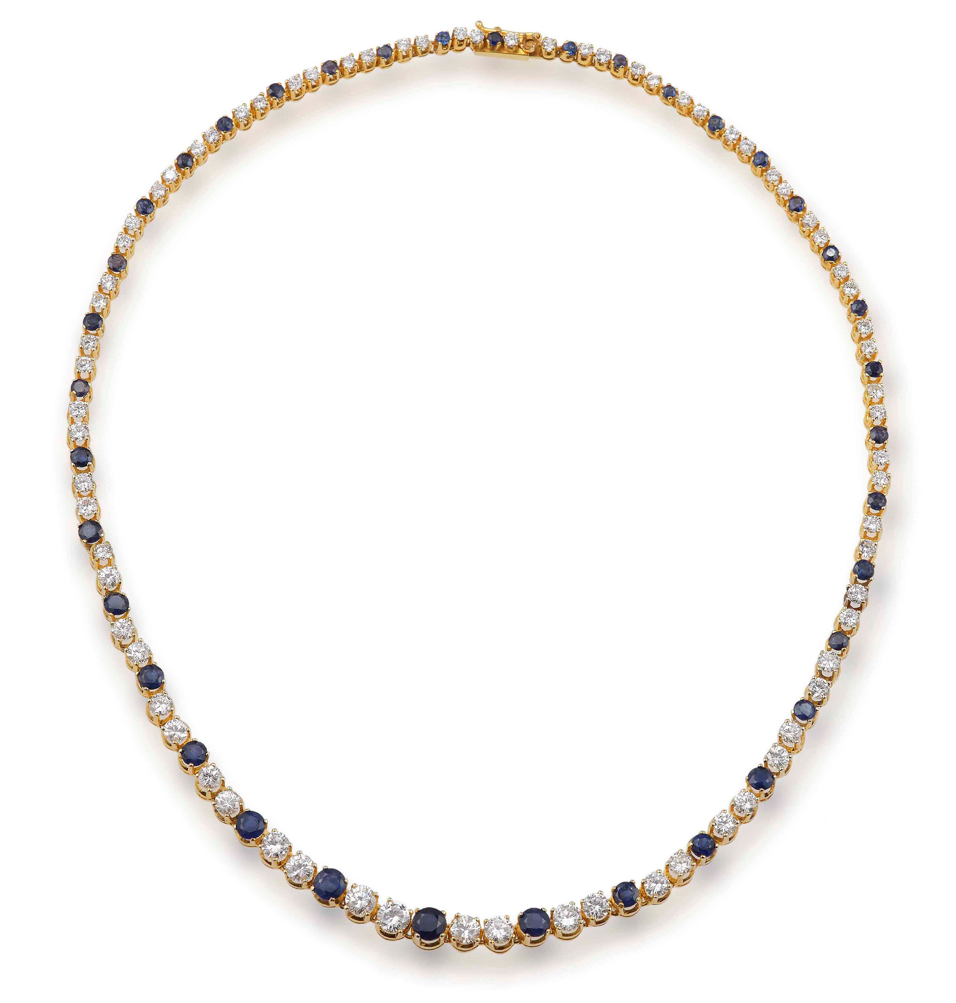 Girocollo con diamanti taglio brillante per ct 5.00 circa e zaffiri per ct 2.00 circa, montatura in oro giallo 750/1000, gr 18,9, cm 37, diamanti per ct 5,00, zaffiri per ct 2,00