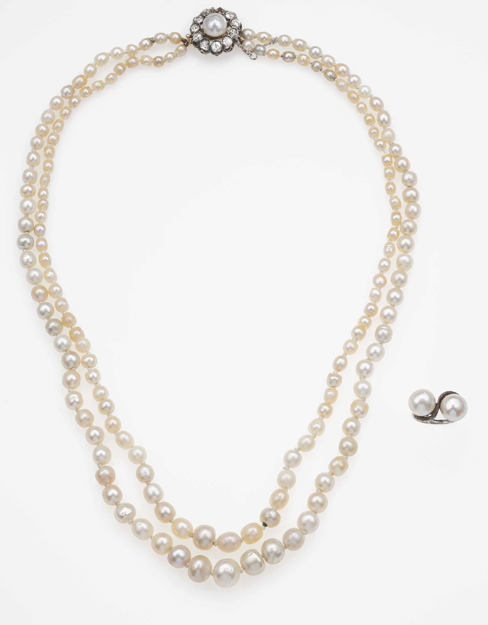 Lotto composto da una collana di perle naturali ed un anello con perle coltivate