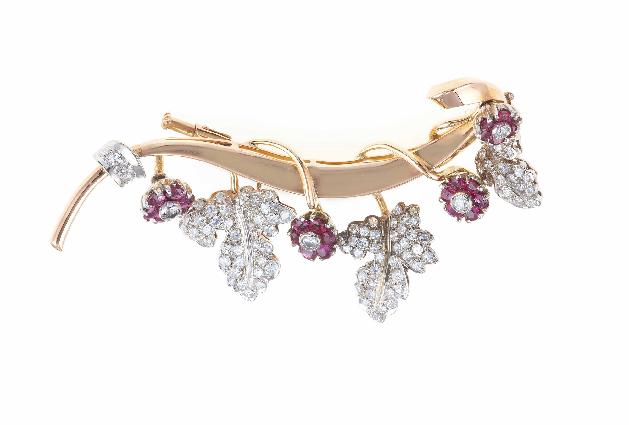 Spilla en-tremblant a soggetto floreale con diamanti e rubini