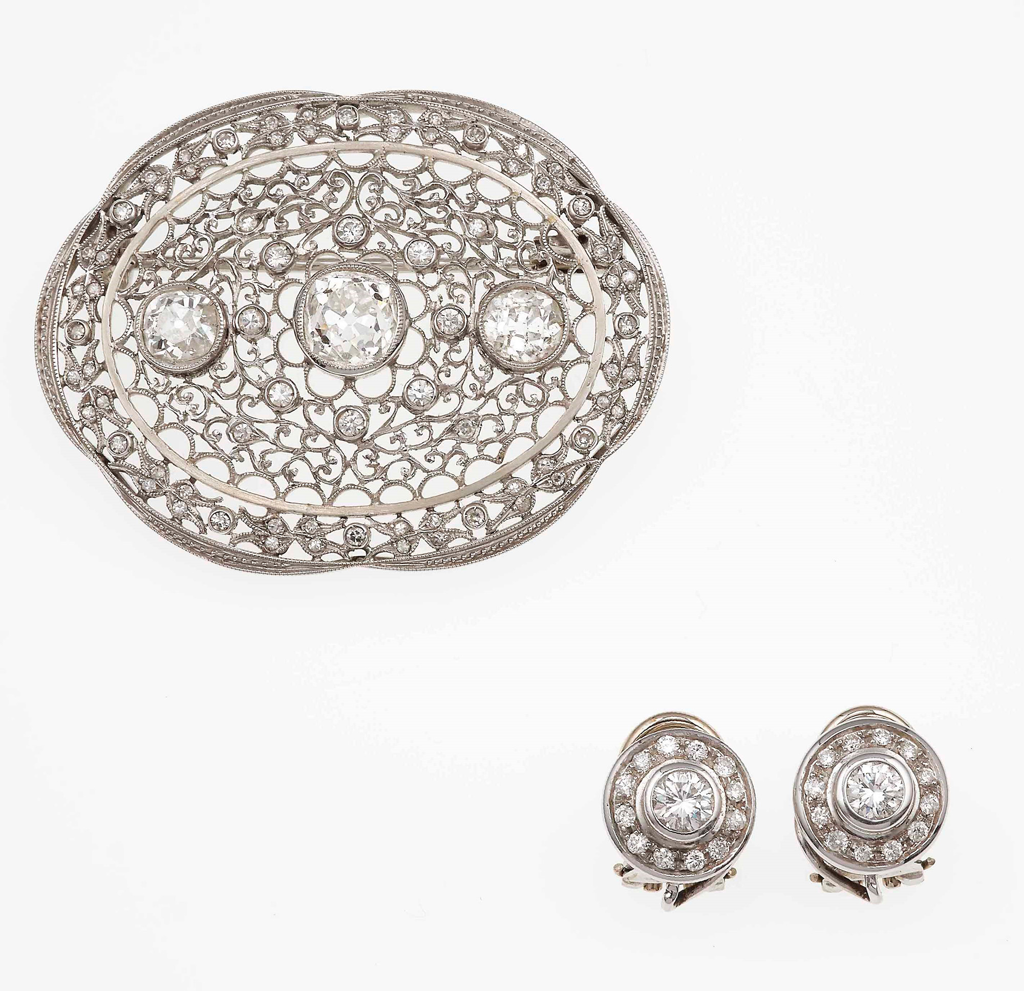 Demi-parure composta da spilla ed orecchini con diamanti, montature in oro bianco 750/1000, Spilla: gr 11.0: cm 4.5 x 3.3 diamanti di vecchio taglio per ct 2.00 circa, Orecchini: a clip senza perno; gr 5.0; diamanti taglio brillante