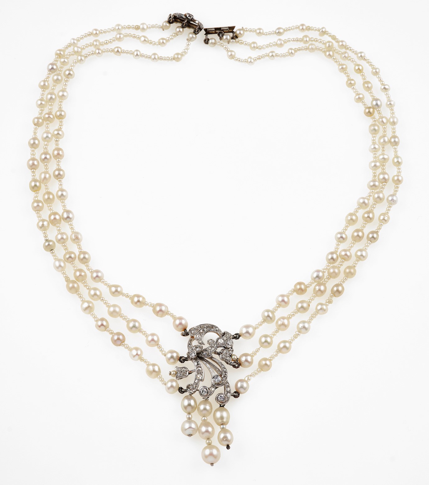 Girocollo a tre fili di perle, montatura in oro bianco 750/1000 con diamanti di vecchio taglio, gr 25.1