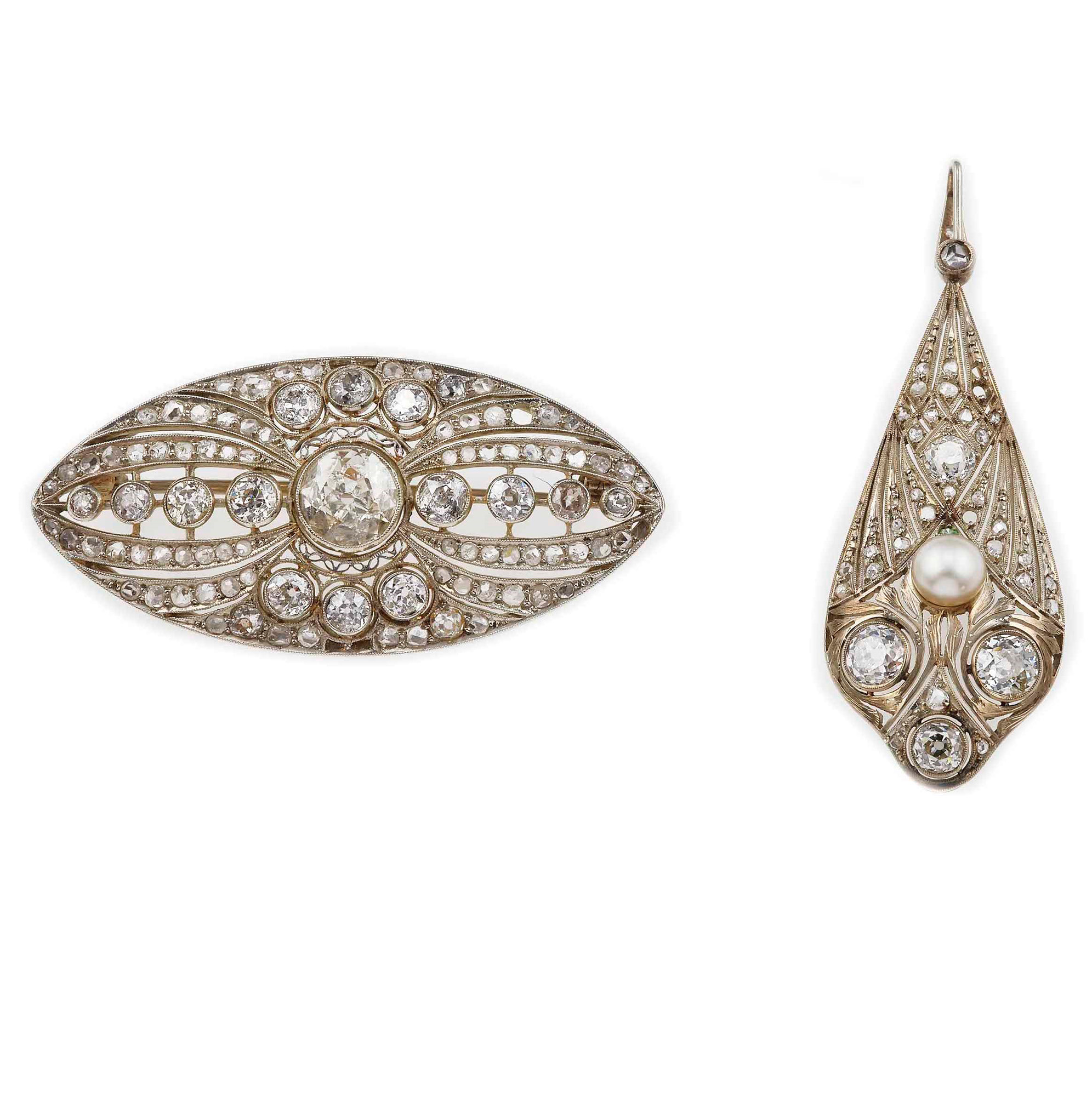 Spilla e pendente con diamanti di vecchio taglio e perla