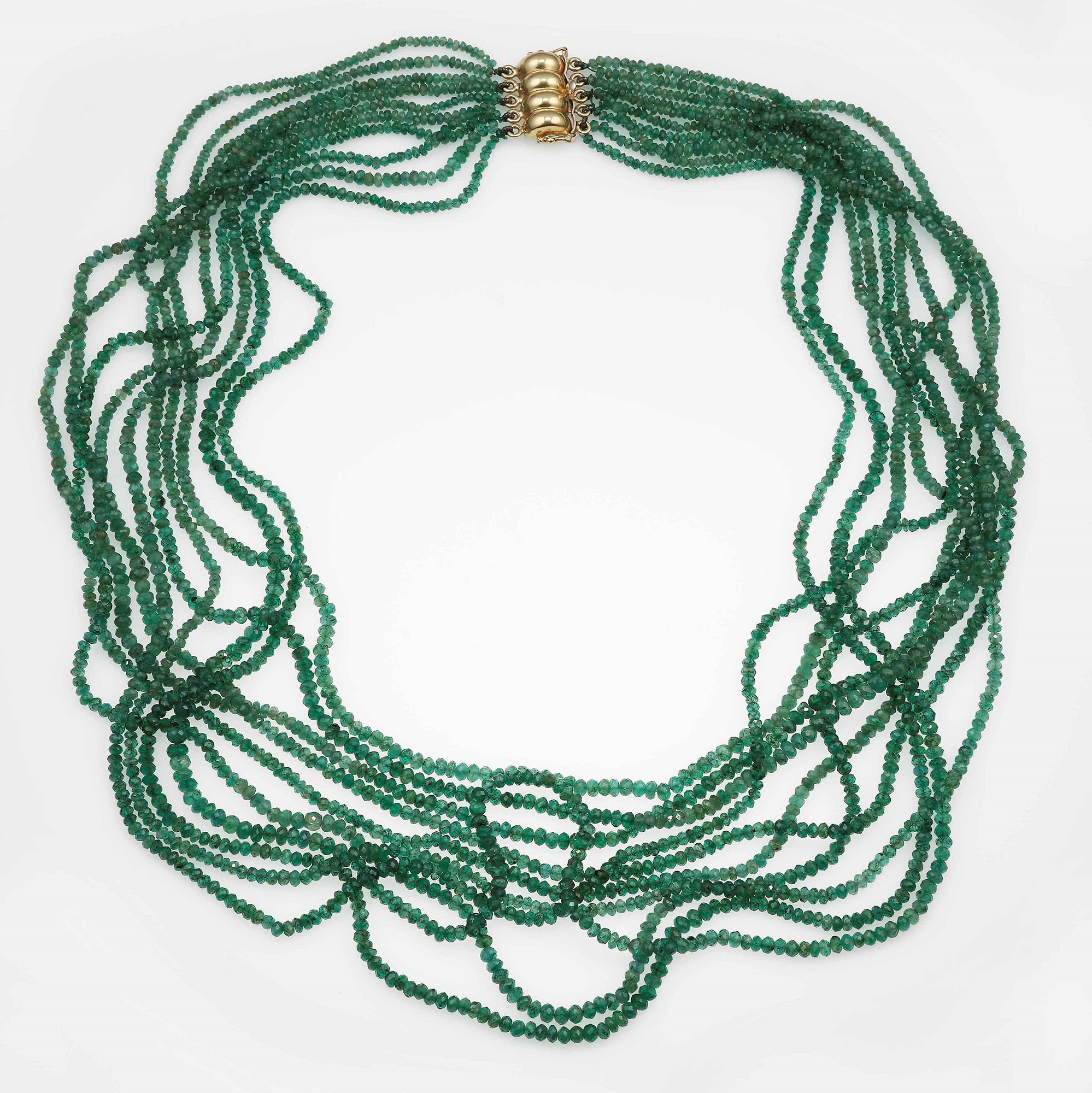 Collana a dieci fili di smeraldi taglio briolette, fermezza in oro giallo 750/1000, gr 101