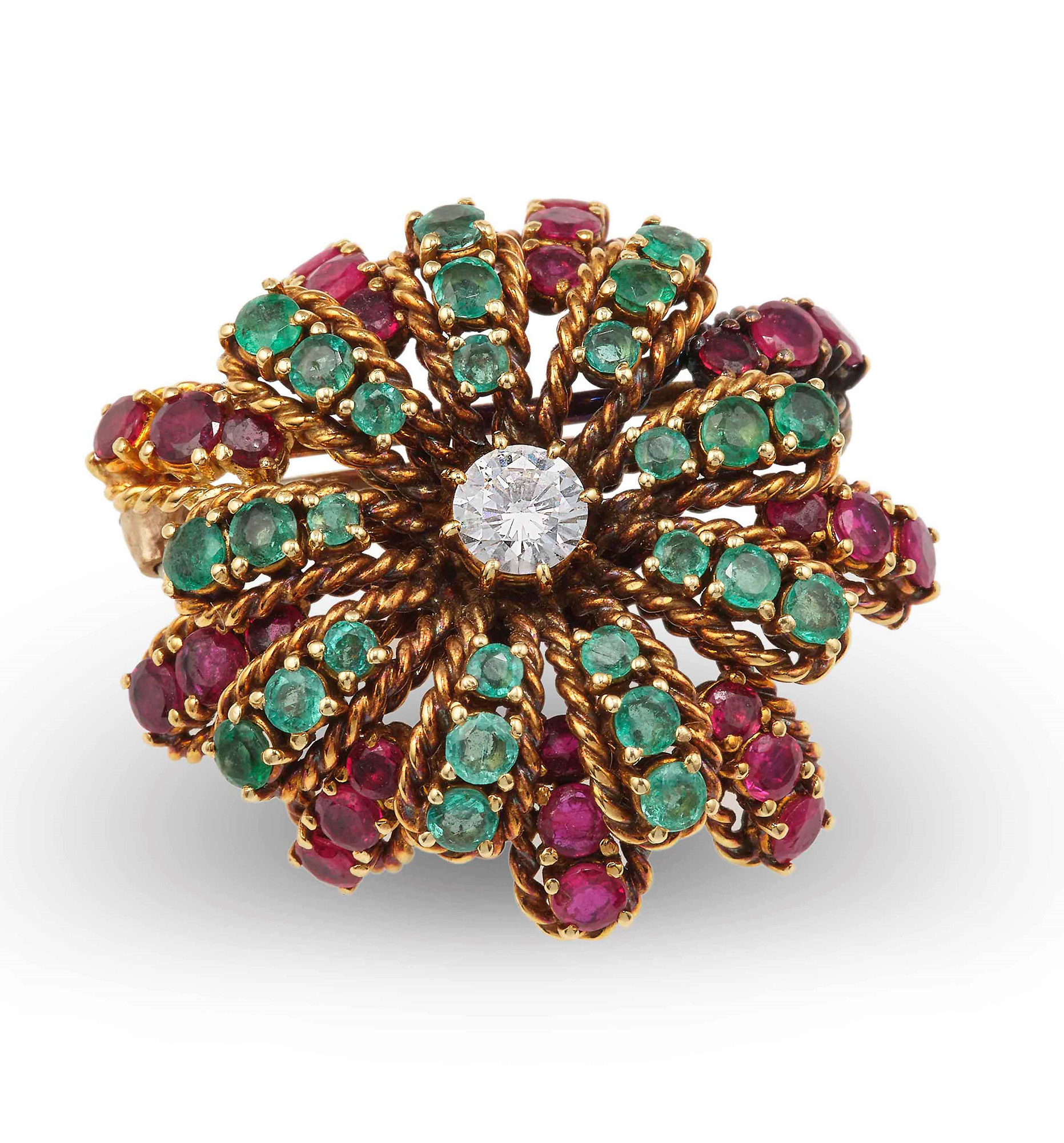 Spilla con diamante, smeraldi e rubini, montatura in oro giallo 750/1000, gr. 13,6, cm 3 x 2.5