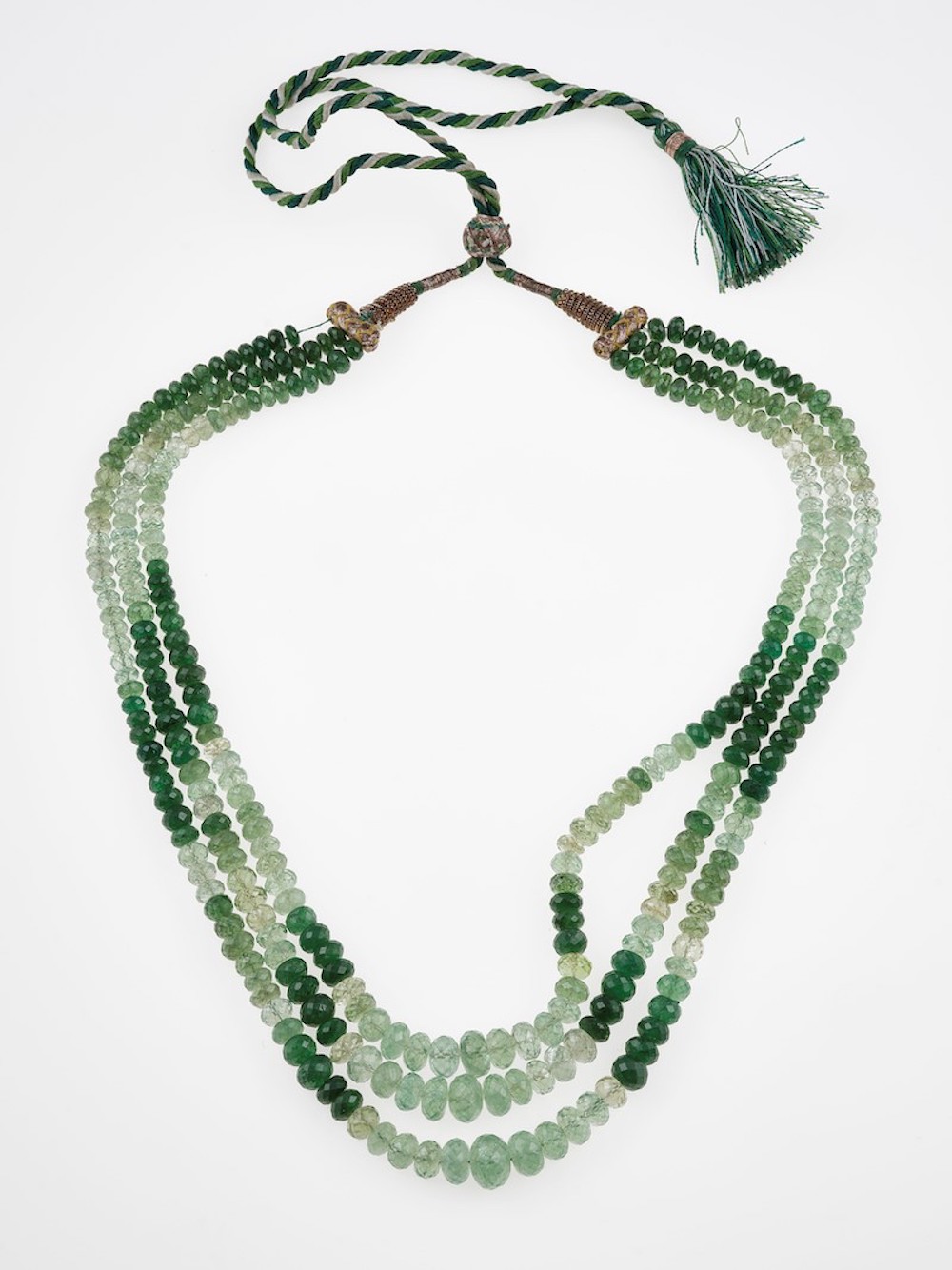 Tre fili di tsavoriti taglio briolette per ct 533.00 circa, gr 110.8, cm 41.5 (filo corto), 47.5 (filo lungo),