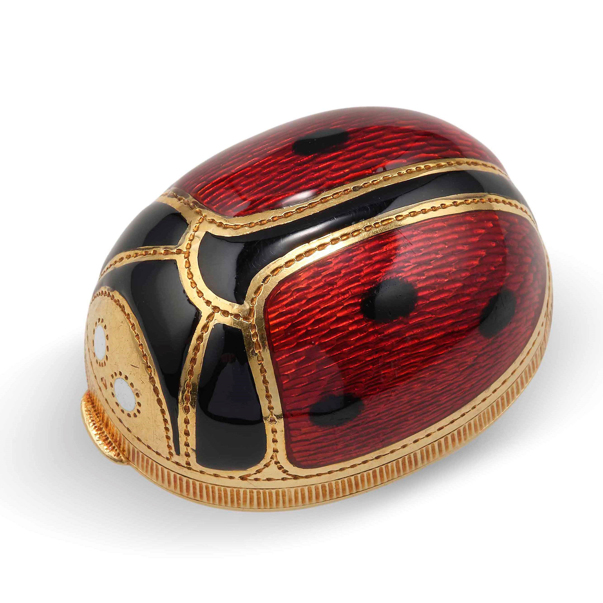 Portapillole "coccinella" con smalti policromi, oro giallo 750/1000, punzone 750 768 CIF EM, gr 28,1, cm 3,5 x 2,6 x h 1,6