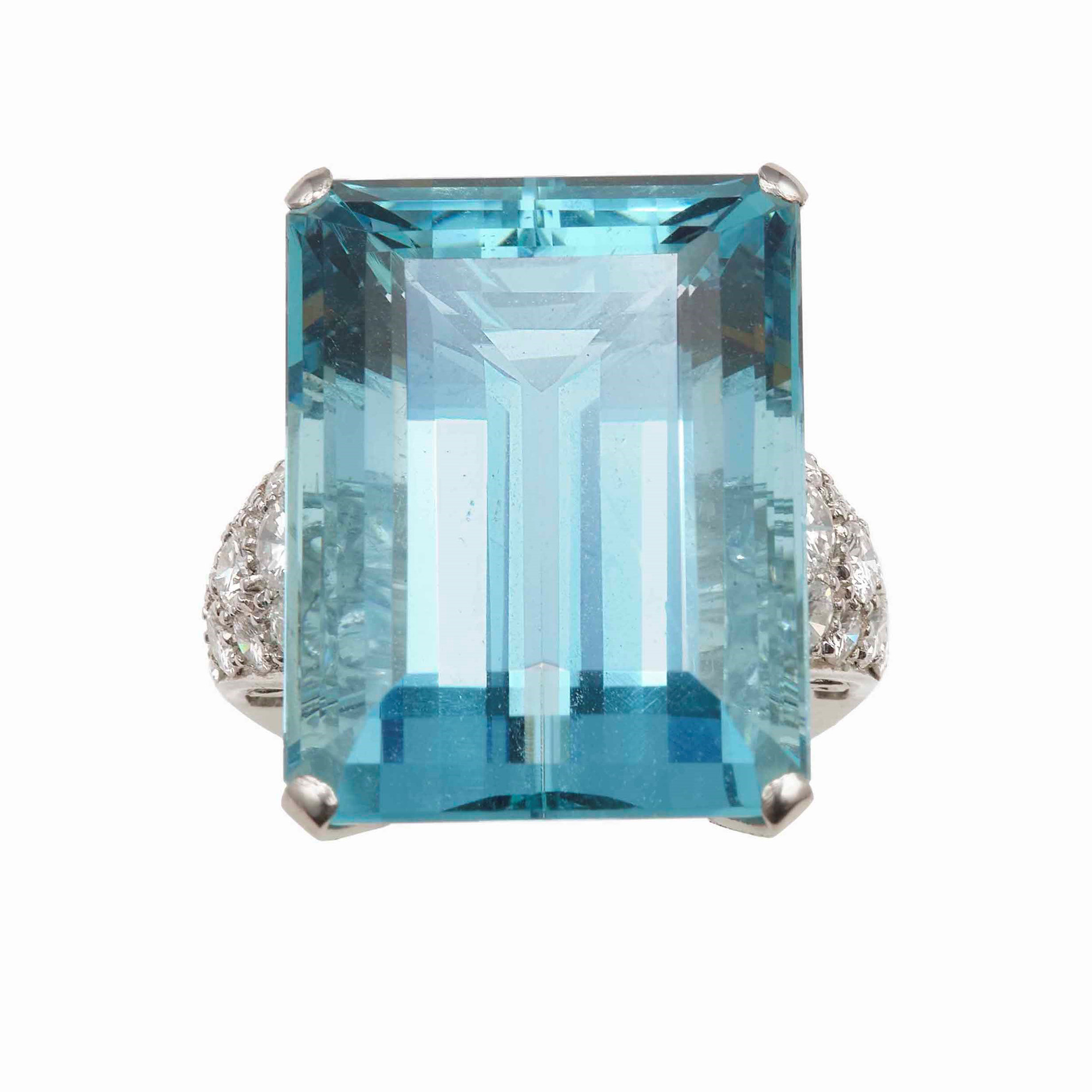 Anello con acquamarina di ct 35.89 circa con diamanti, montatura in platino, gr 15,2, misura italiana 10.5