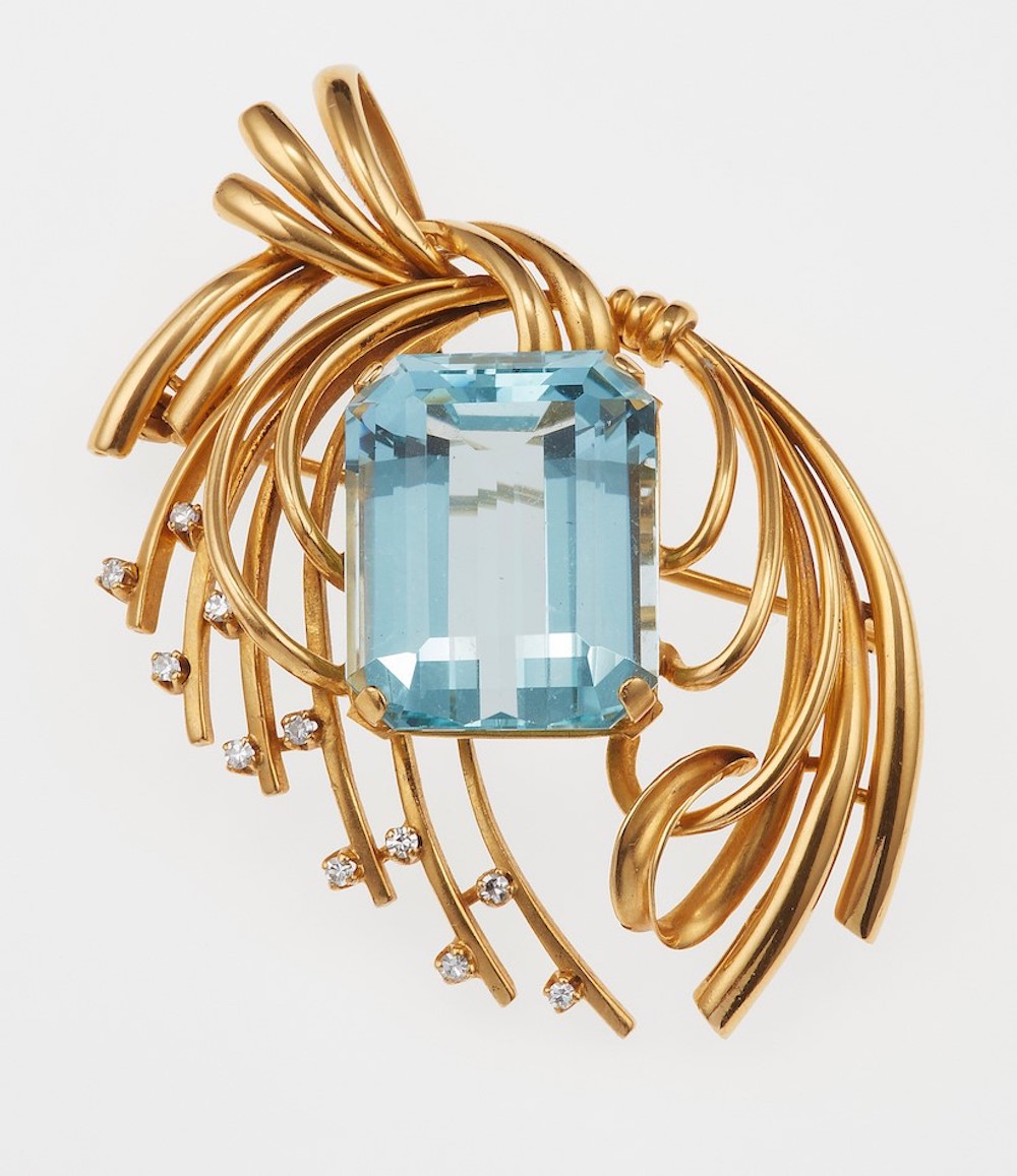 Parodi. Spilla con grande acquamarina di ct 39.00 circa, montatura in oro giallo 750/1000, gr 33.2, cm 6x4.5