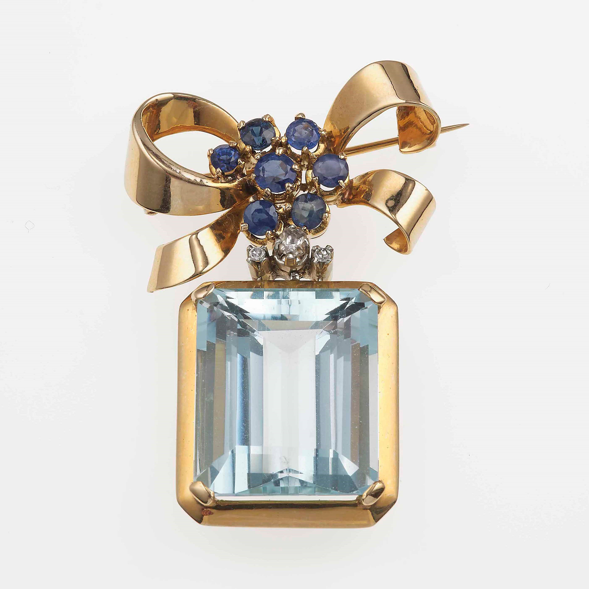 Spilla con acquamarina di ct 34.00 circa, zaffiri e diamanti