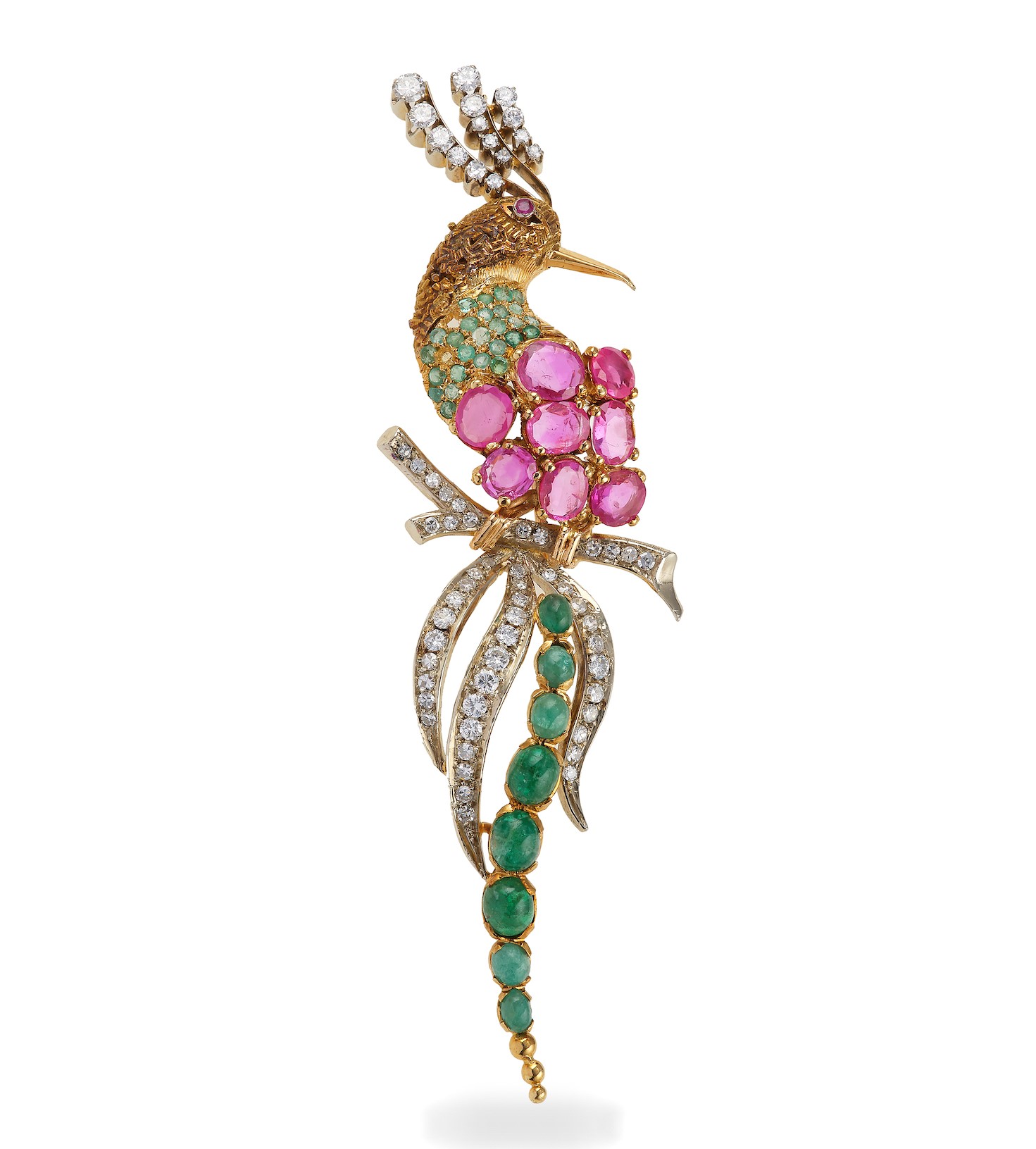 Spilla "Uccello del Paradiso" con rubini, smeraldi e diamanti