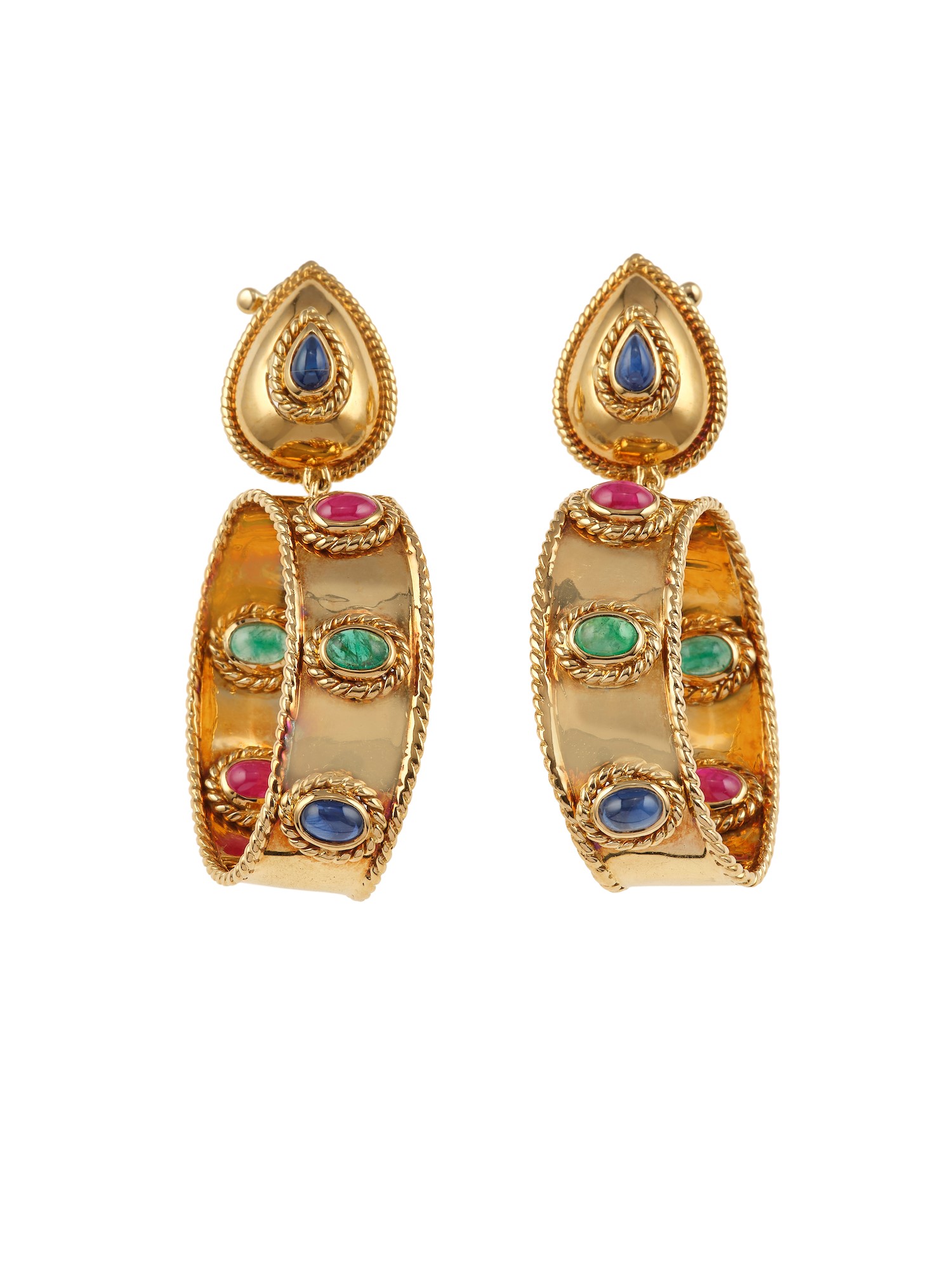 Sabbadini. Orecchini pendenti con zaffiri, rubini e smeraldi taglio cabochon, montatura in oro giallo 750/1000. Astuccio originale, clip senza perno, gr 49.1, cm 6 x 2.8