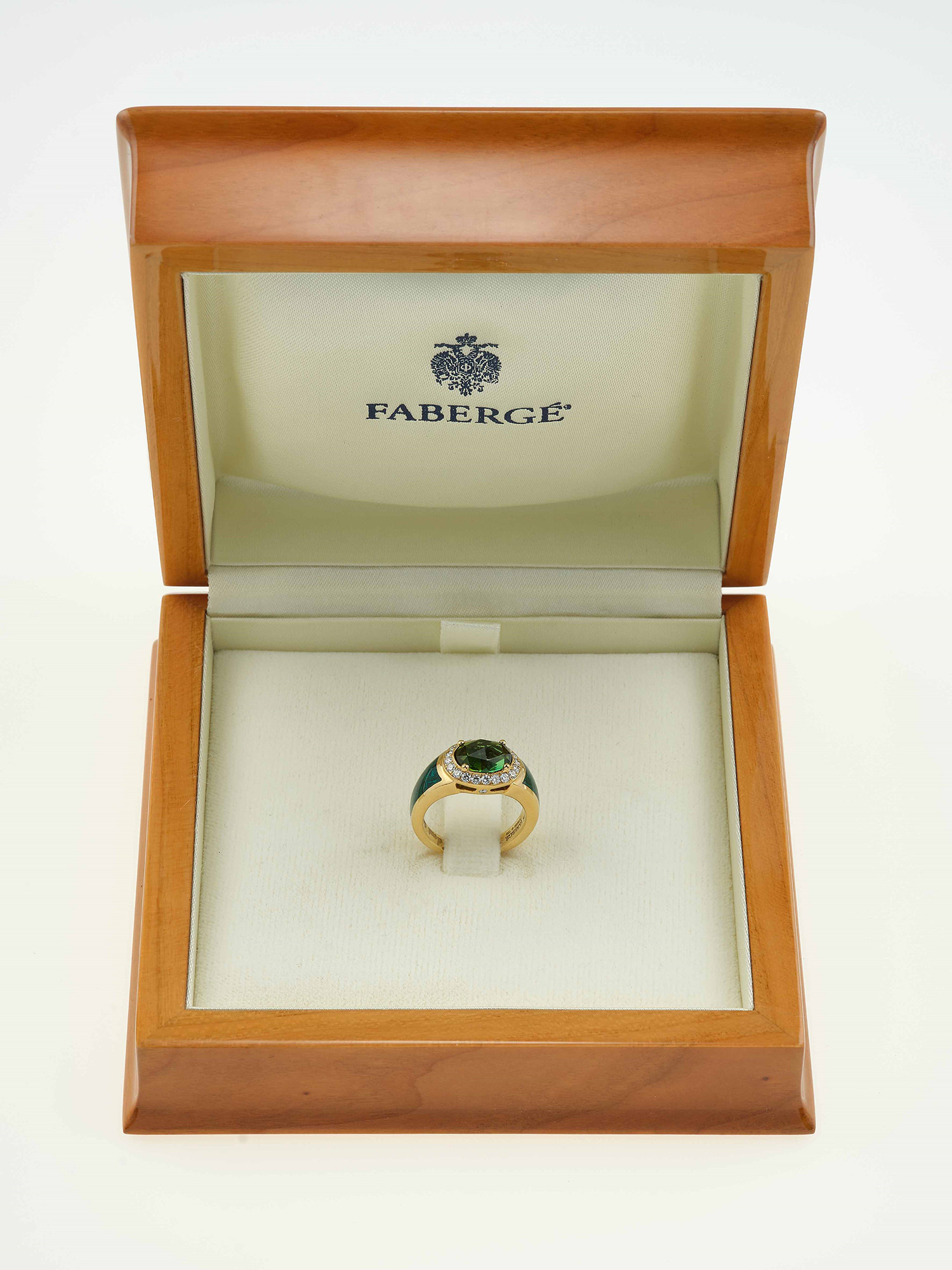 Fabergè. Anello con peridoto, diamanti e smalto verde, montatura in oro giallo 750/1000. Numerato 71/1000. Scatola originale, gr 9.5, misura italiana 11
