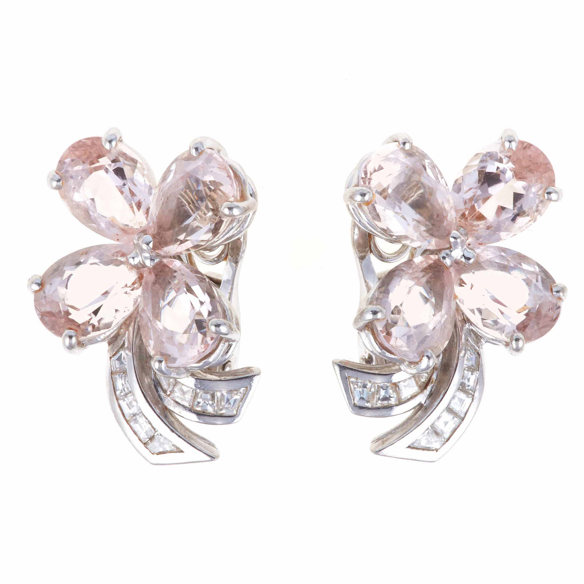 Faraone. Orecchini con morganiti e diamanti, montatura in platino ed oro bianco 750/1000, clip senza perno, gr totali 19,5, cm 2,5 x 1,6