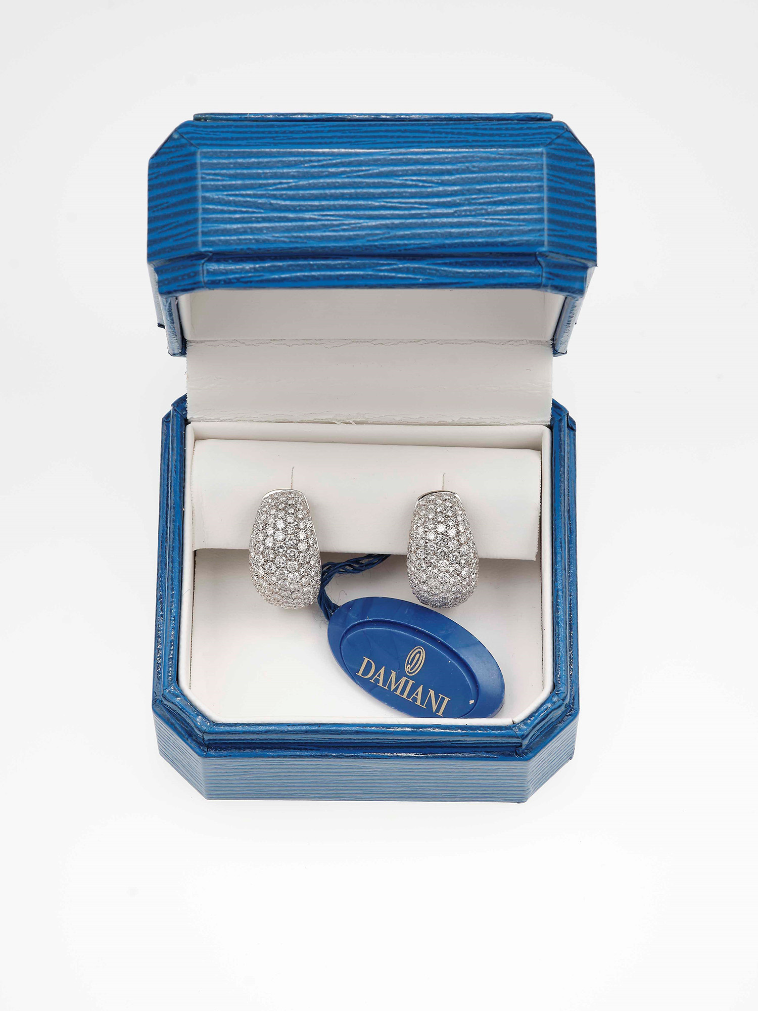 Damiani. Orecchini con pavè di diamanti per ct 2.40, montatura in oro giallo ed oro bianco 750/1000. Astuccio e garanzia, gr 14,3