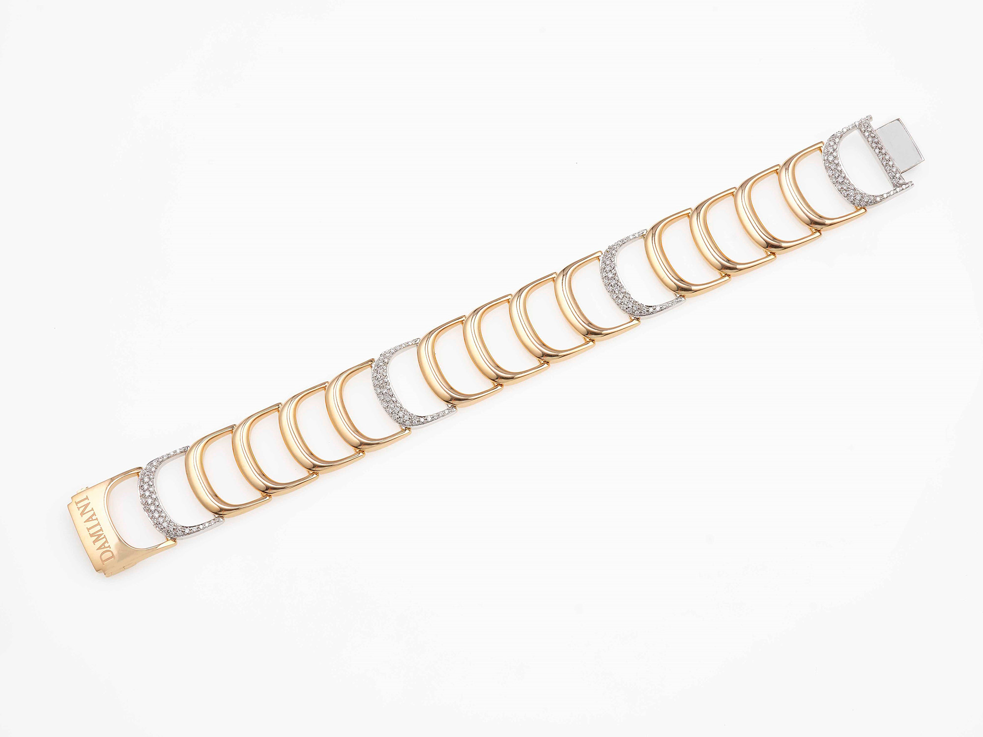 Damiani. "Damianissima" bracciale con diamanti, montatura in oro giallo ed oro bianco 750/1000. Astuccio, gr 50,0, cm 17,7 x 1,8