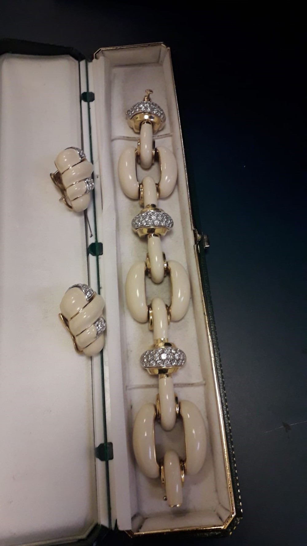 David WEBB. Demi-parure composto da bracciale ed orecchini con smalto e diamanti, montature in oro giallo ed oro bianco 750/1000