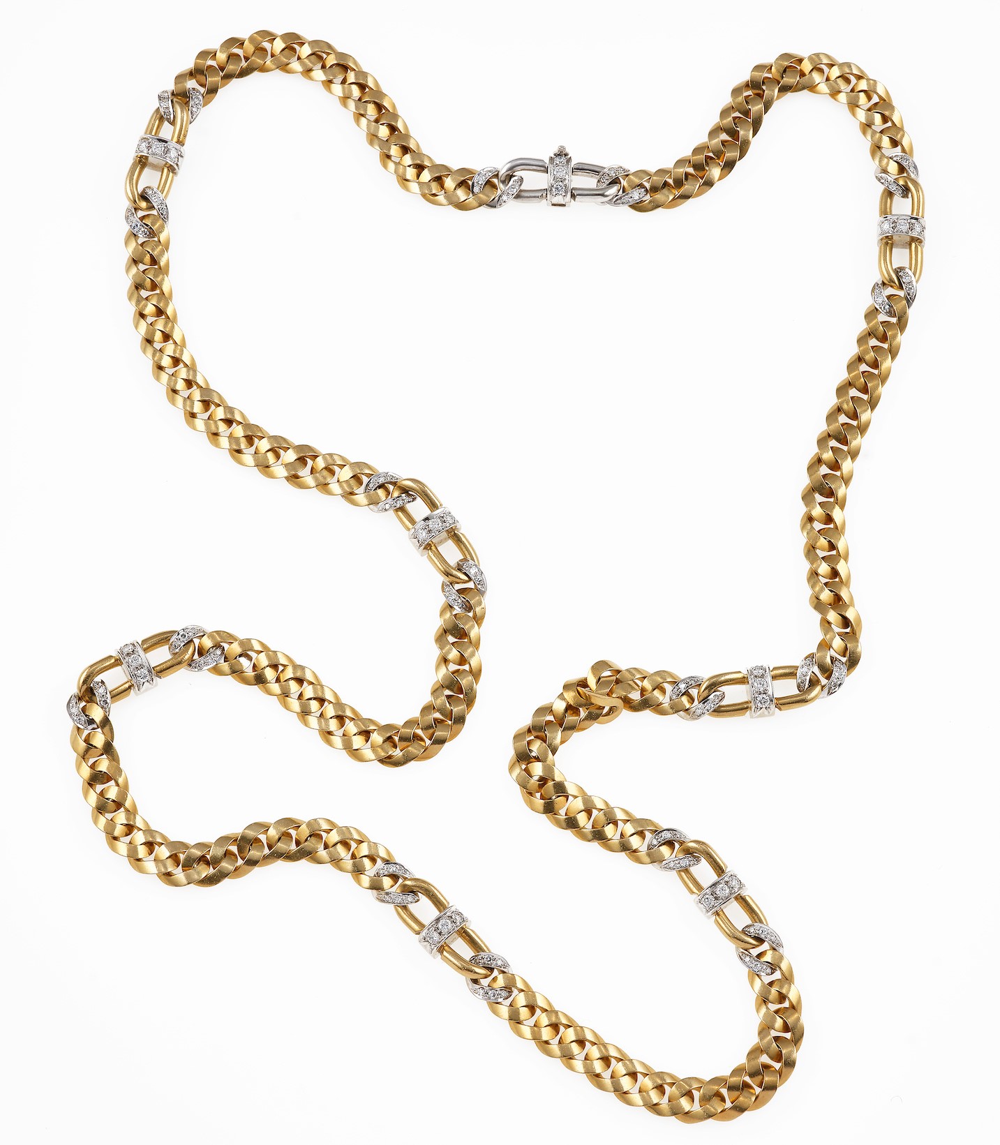 Pomellato. Lunga catena a maglia groumette con diamanti, montatura in oro giallo ed oro bianco 750/1000, gr. 146,7, cm 83, punzone 469MI