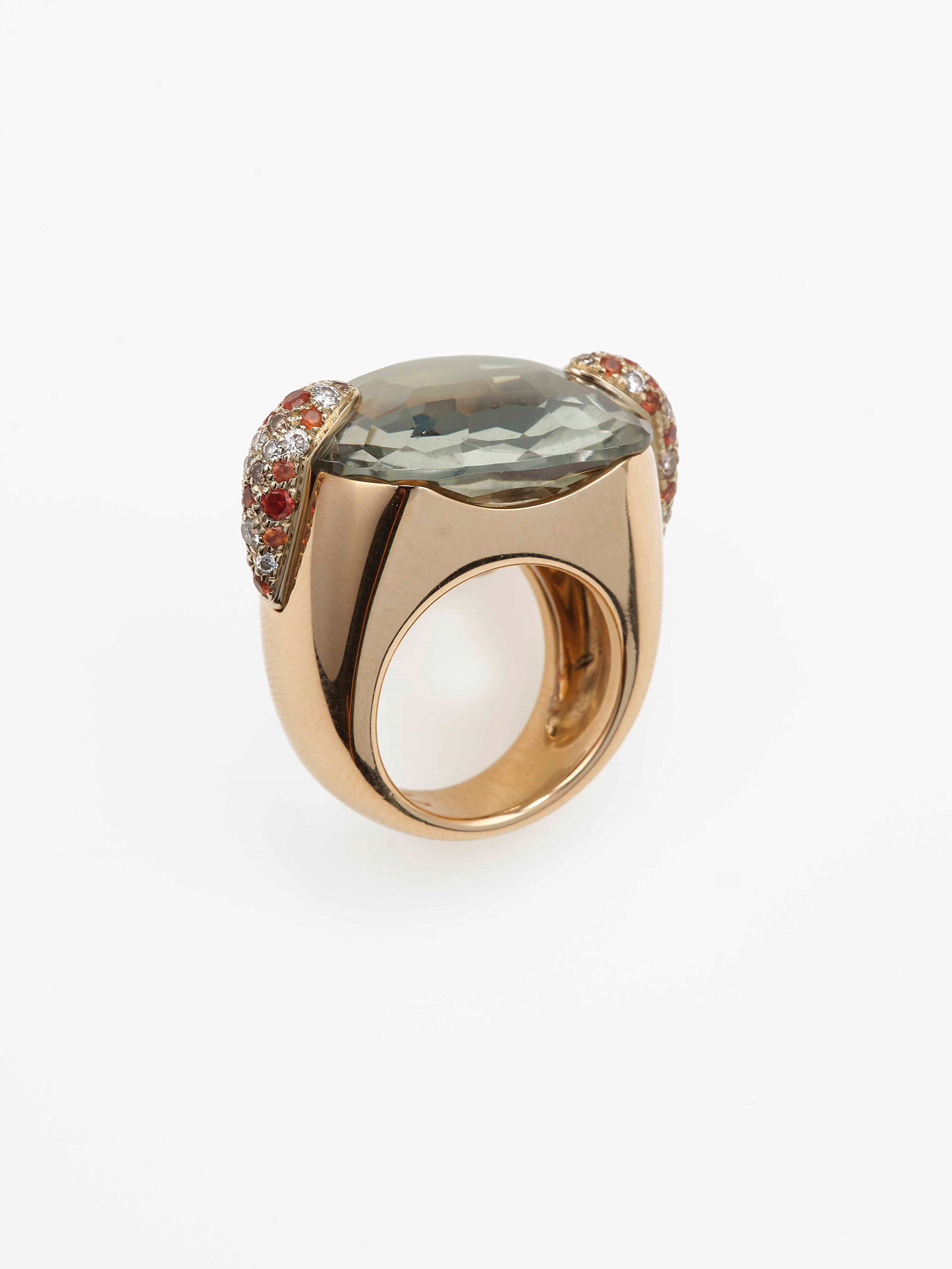 Pomellato. Anello "Pin Up" con prasiolite e diamanti, montatura in oro rosa 750/1000. Astuccio originale e garanzia, misura italiana 13, gr. 29,6