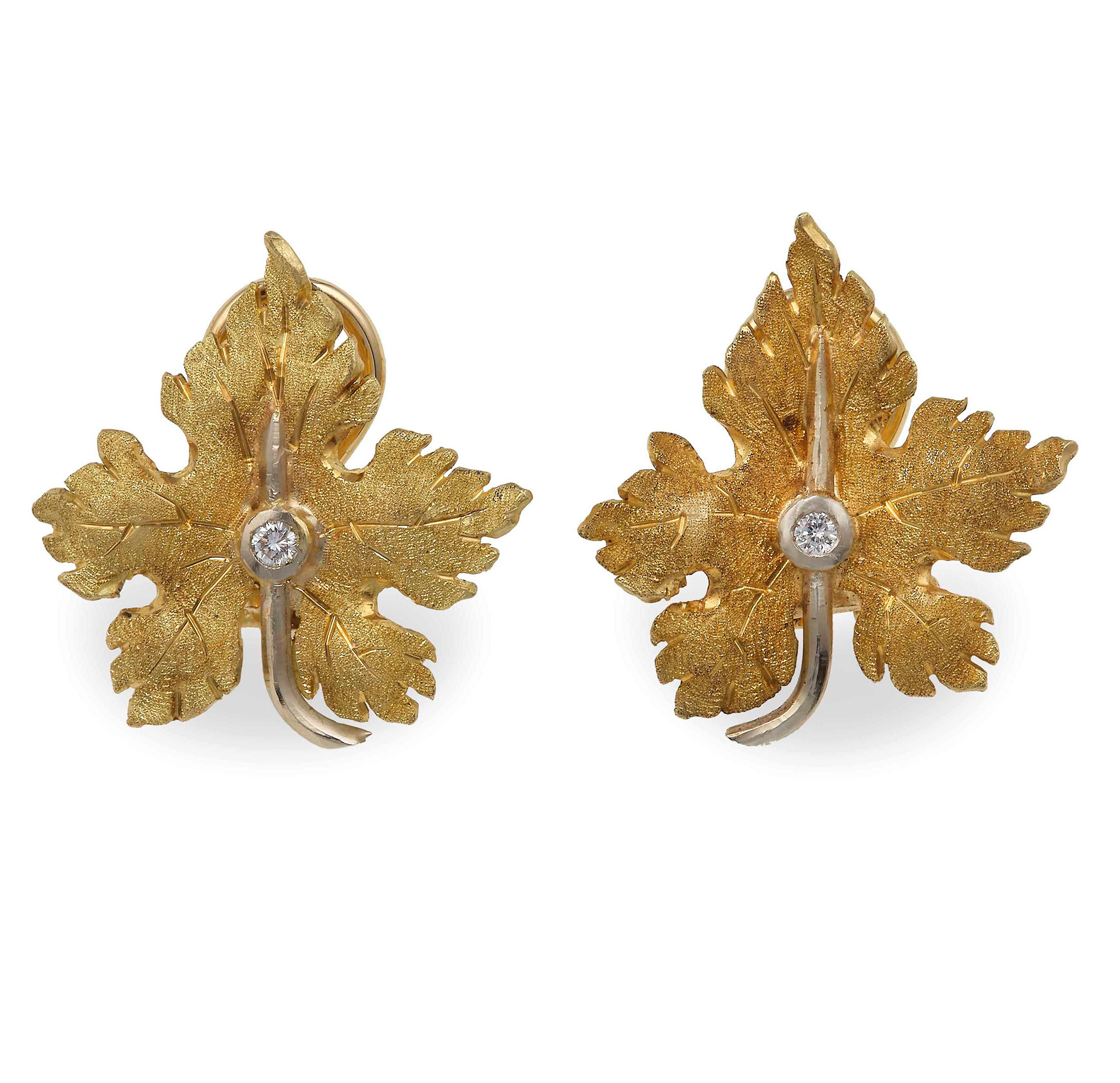 M. Buccellati. Orecchini "foglia" con piccolo diamante, montatura in oro giallo 750/1000 liscio e satinato, orecchini a clip con perno, gr totali 7,8, cm 2 x 2