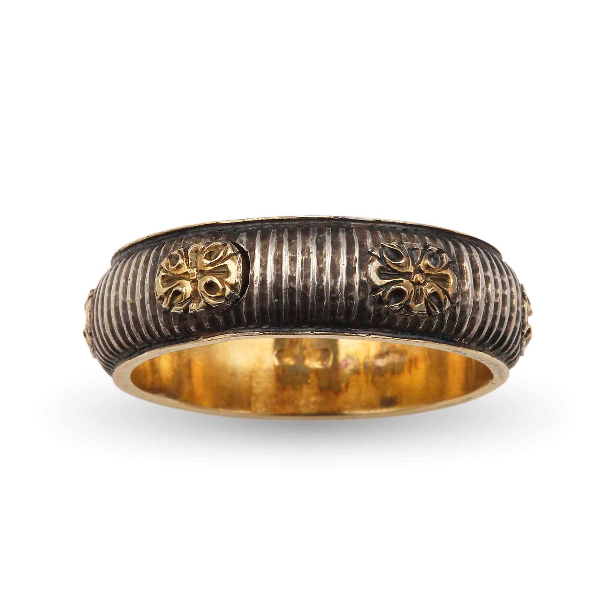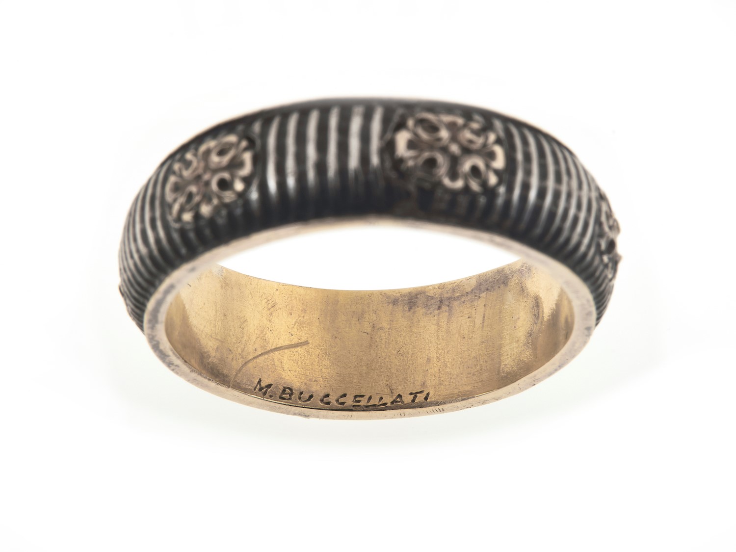 M. Buccellati. Anello inciso, montatura in oro giallo 750/1000 ed argento, misura italiana 18, gr. 7,8, punzone 15MI
