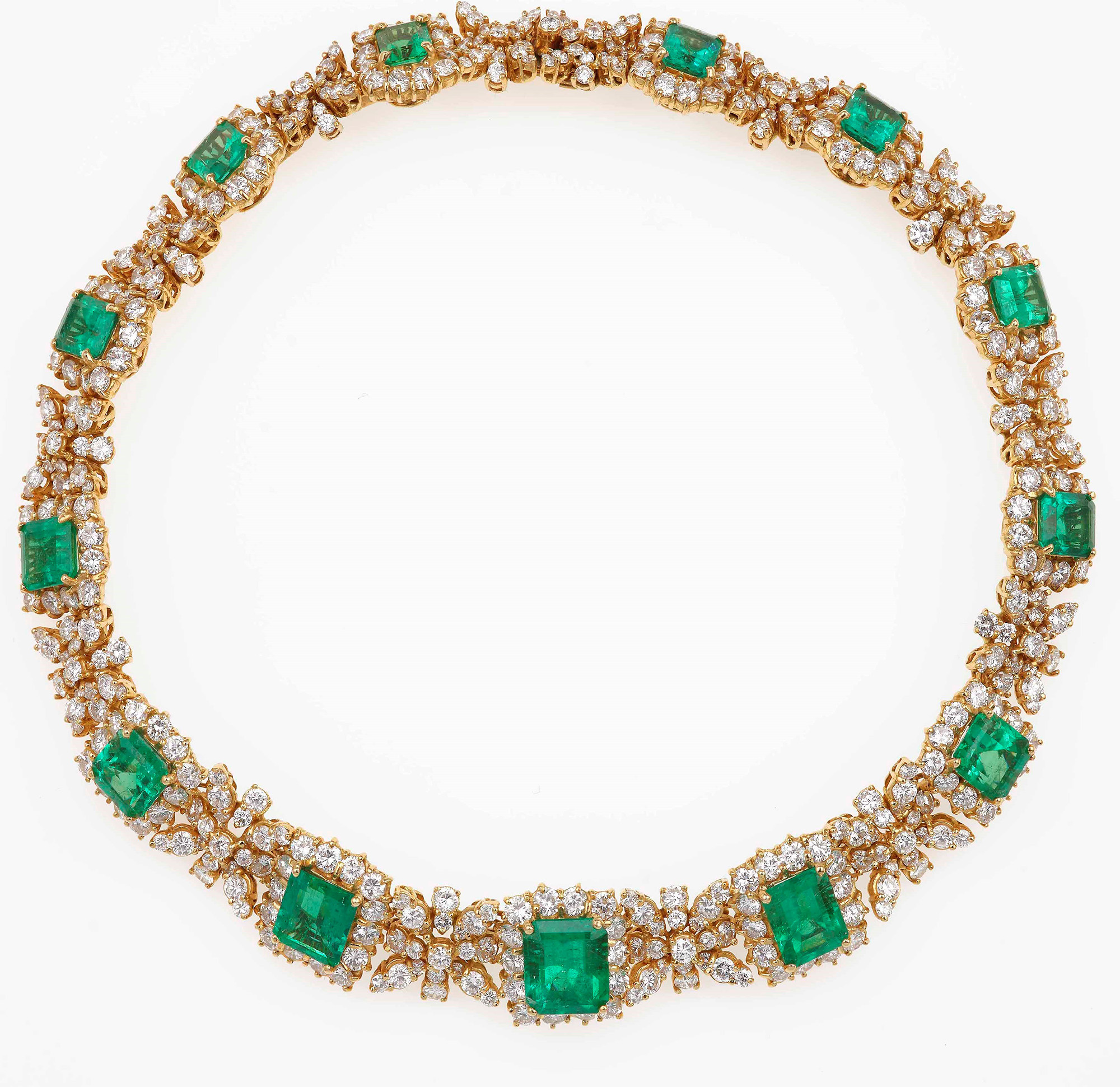 Girocollo con 13 smeraldi Colombia per ct 46.00 circa e diamanti taglio brillante, montatura in oro giallo 750/1000, gr. 121,8
