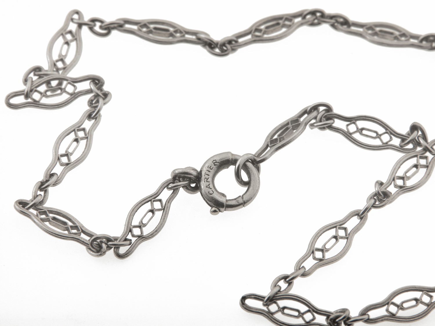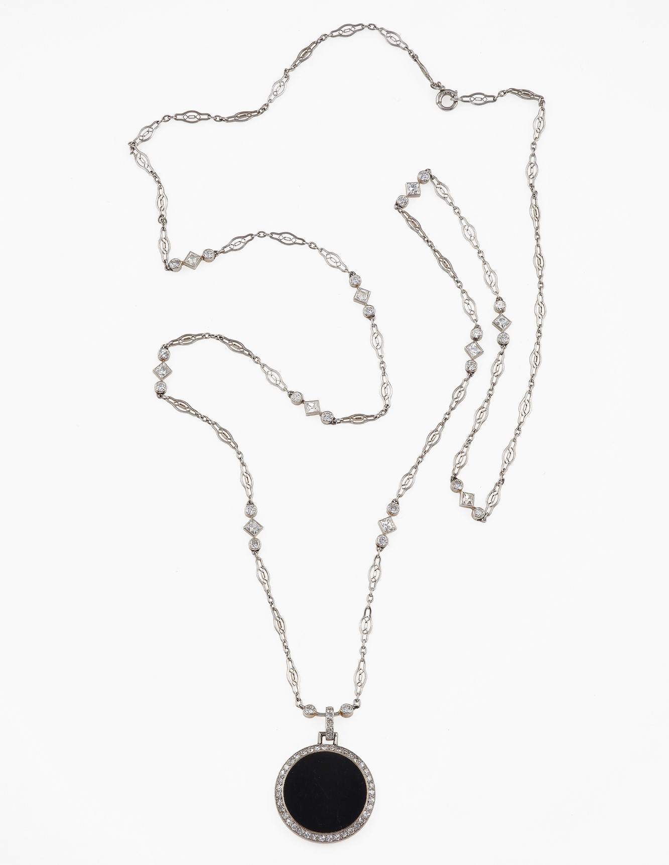 Cartier. Catena con diamanti, montatura in platino. Firmata e numerata 251443., Pendente in platino con smalto nero e diamanti, privo di firma, gr. 26,3, è firmata solo la catena