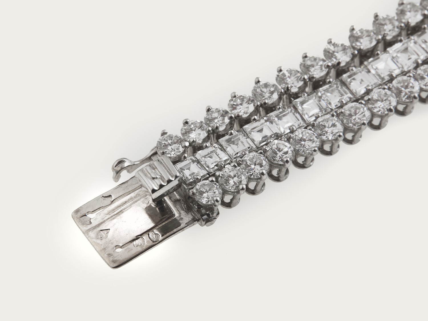 Bracciale con diamanti taglio brillante e taglio square per ct 21.30 circa, montatura in platino, gr 47,5, cm 17,5 x 1, punzoni francesi GB