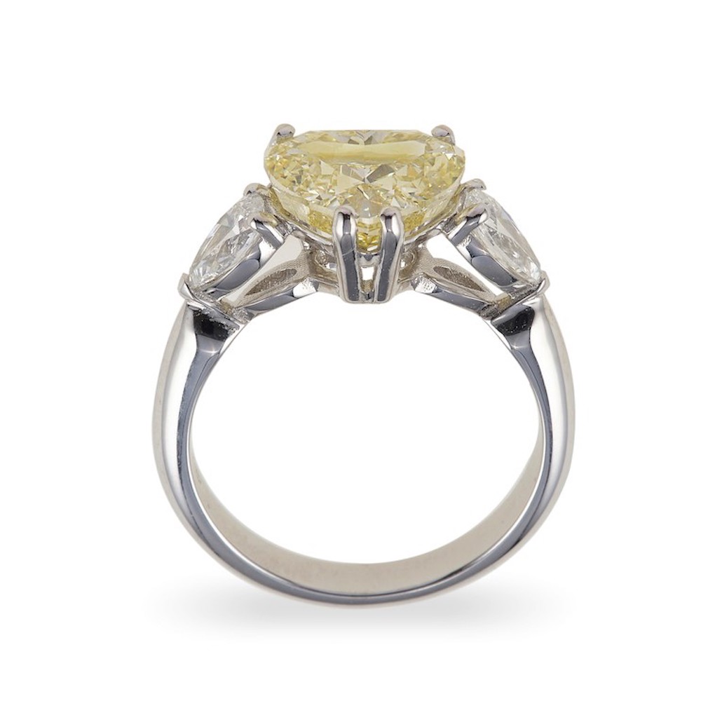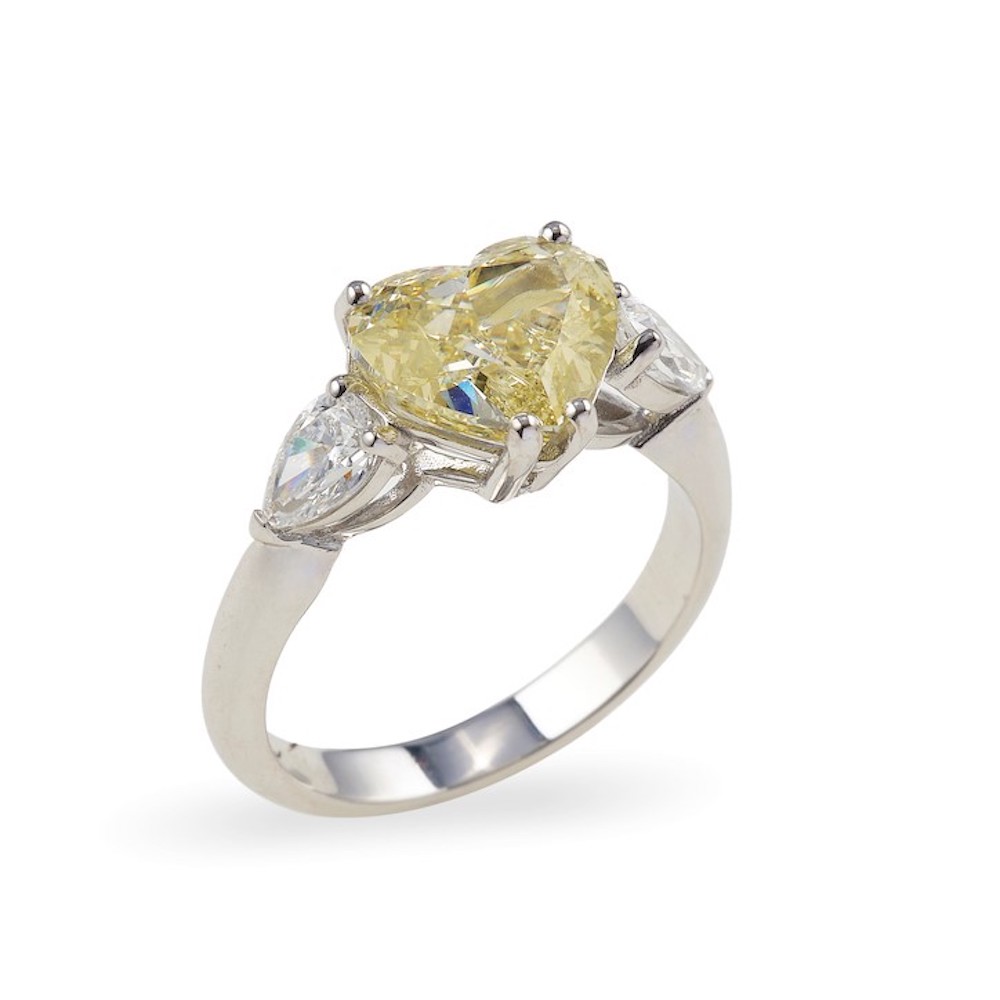 Solitaire taglio cuore di ct 3.04, fancy yellow, clarity IF, fluorescence none, Diamond Report GIA n. 6392040532, misura italiana 14