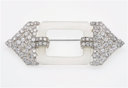 Spilla con diamanti taglio brillante e cristallo di rocca, montatura in oro bianco 750/1000, gr. 28,0, cm 8.5 x 3
