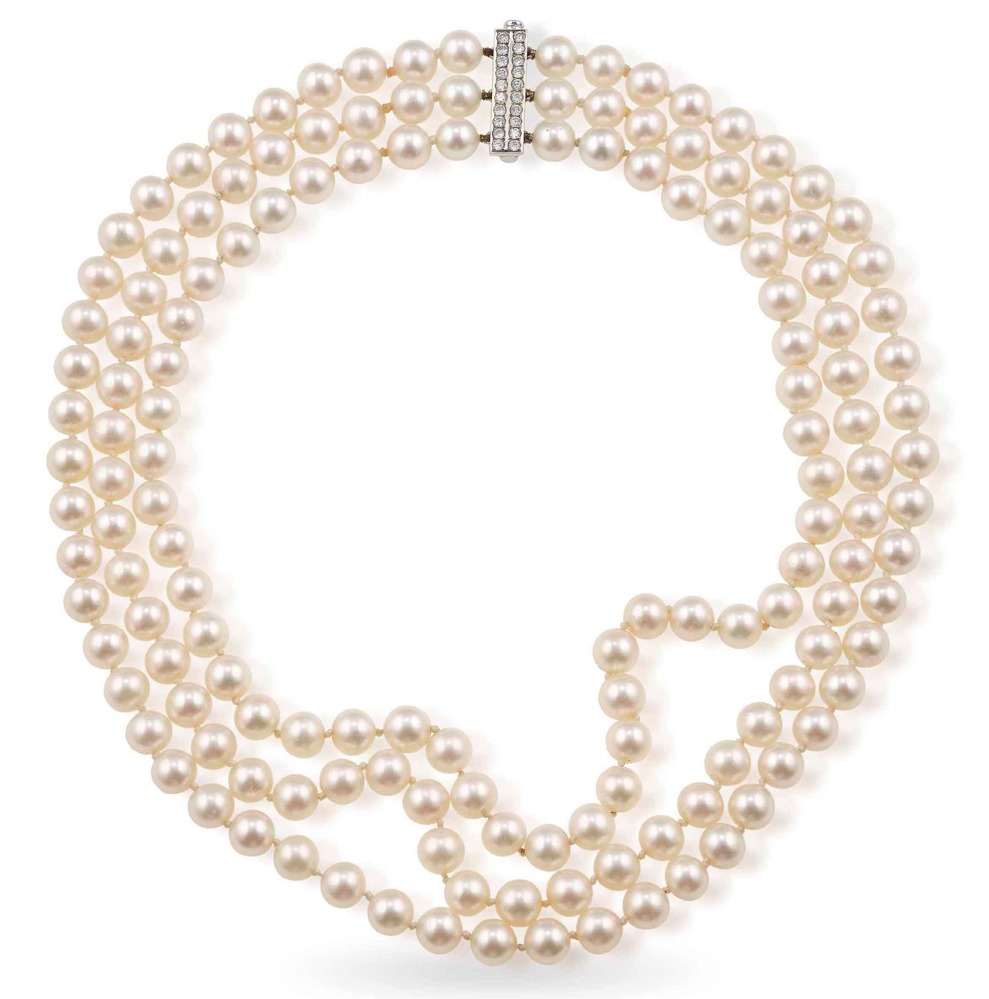 Collana a tre fili di perle coltivate, fermezza in oro bianco 750/1000 con diamanti, gr. 118,9