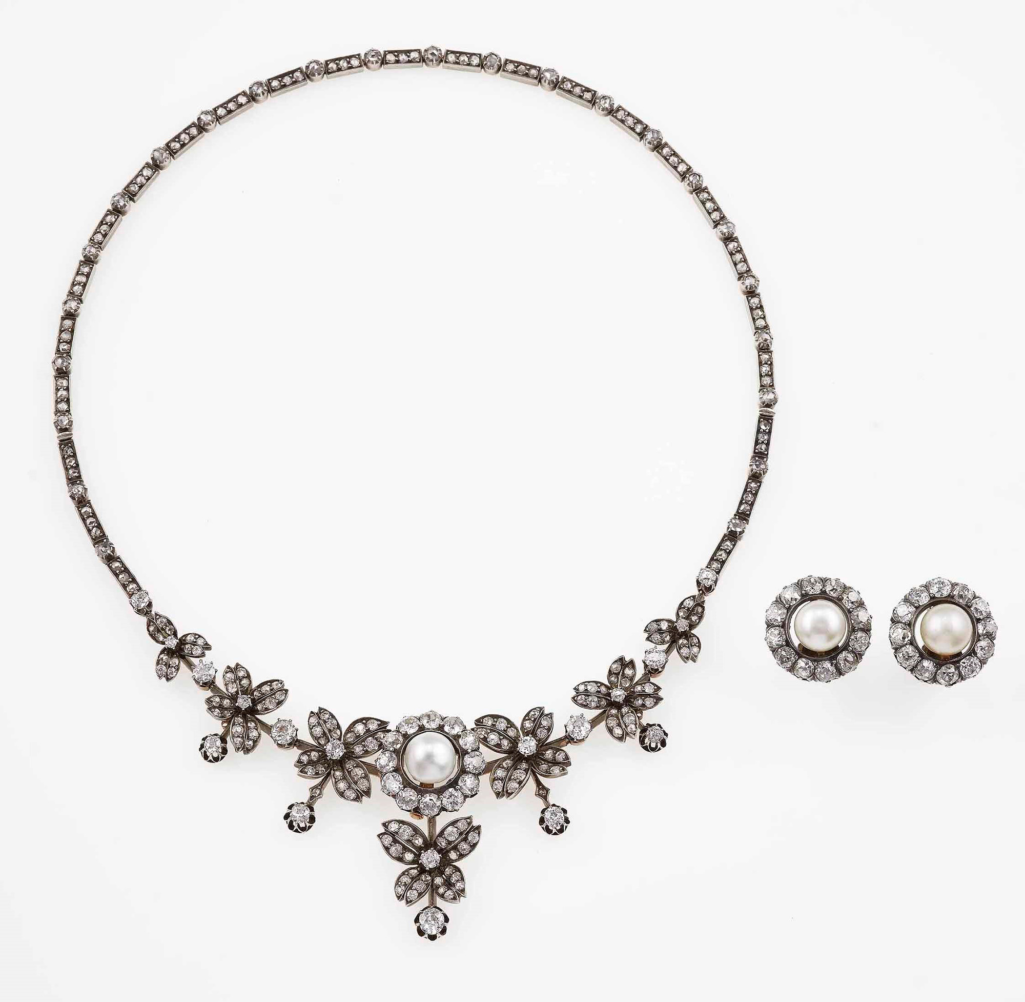 Lotto 536 | Demi-parure composta da girocollo ed orecchini con perle naturali e diamanti di vecchio taglio