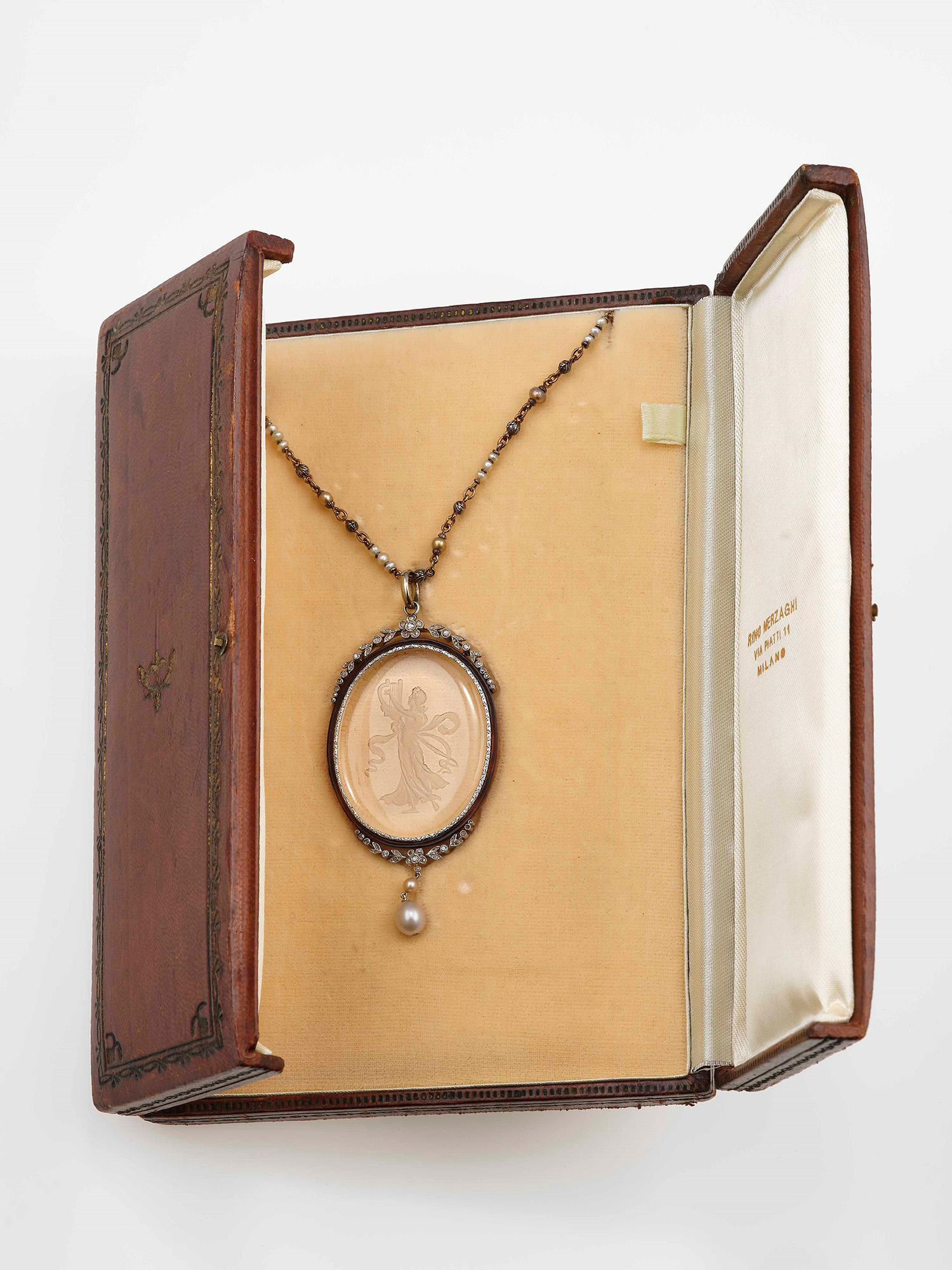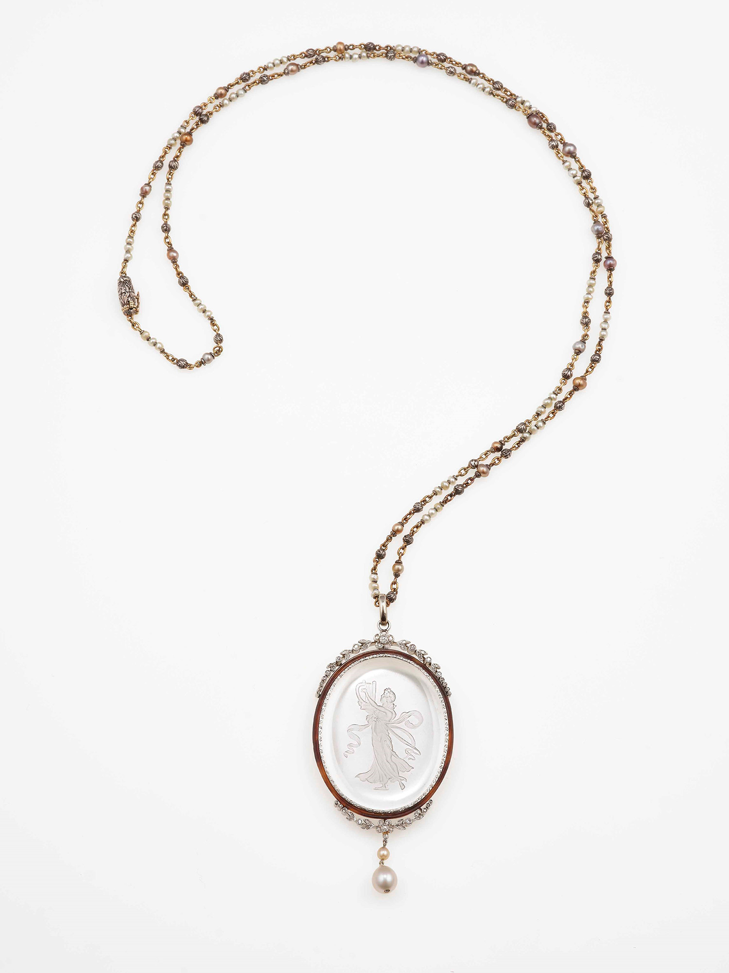 Châtelaine con perle naturali e cristallo di rocca inciso, montatura in oro giallo 750/1000 ed argento, gr. 32,1