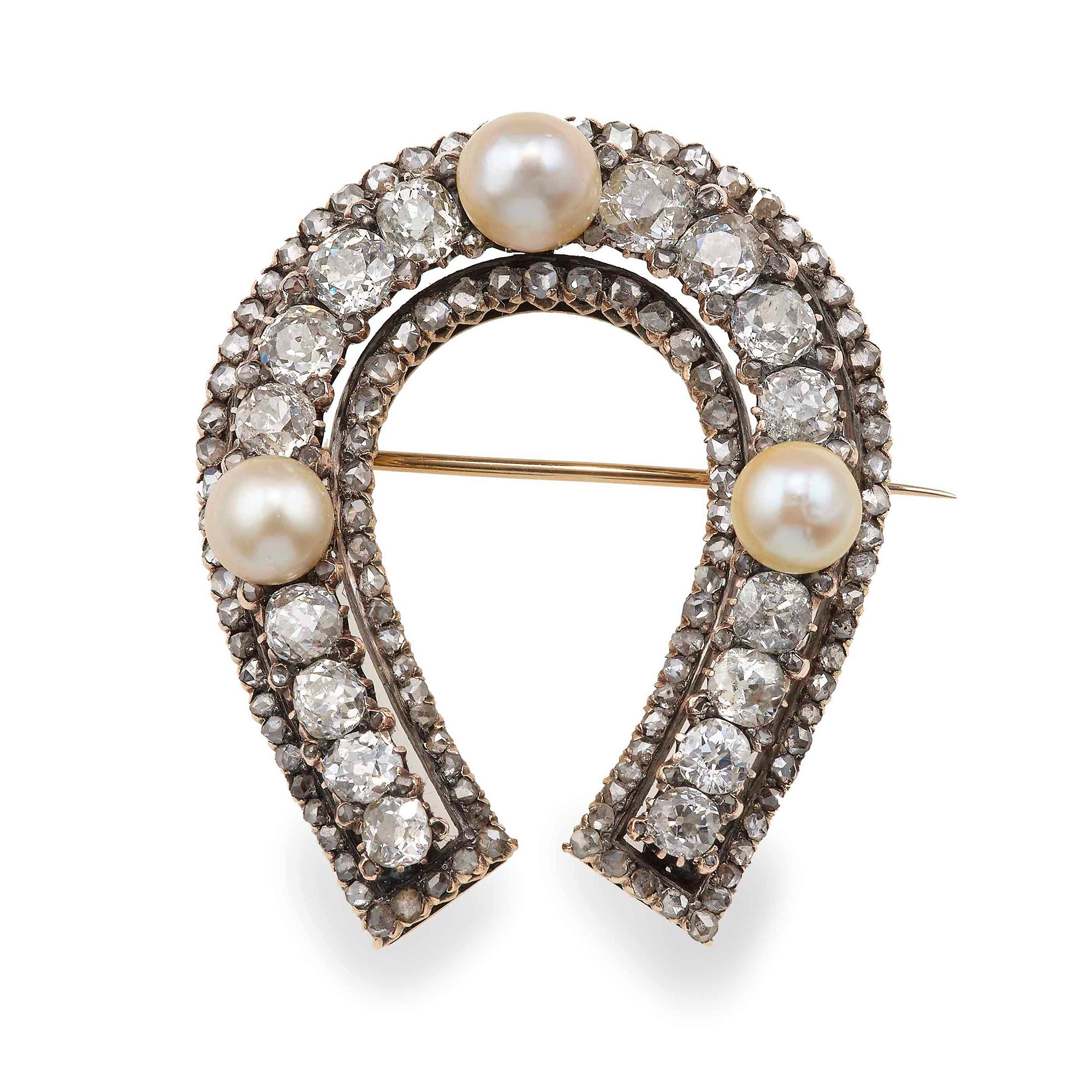 Spilla "ferro di cavallo" con perle coltivate e diamanti di vecchio taglio