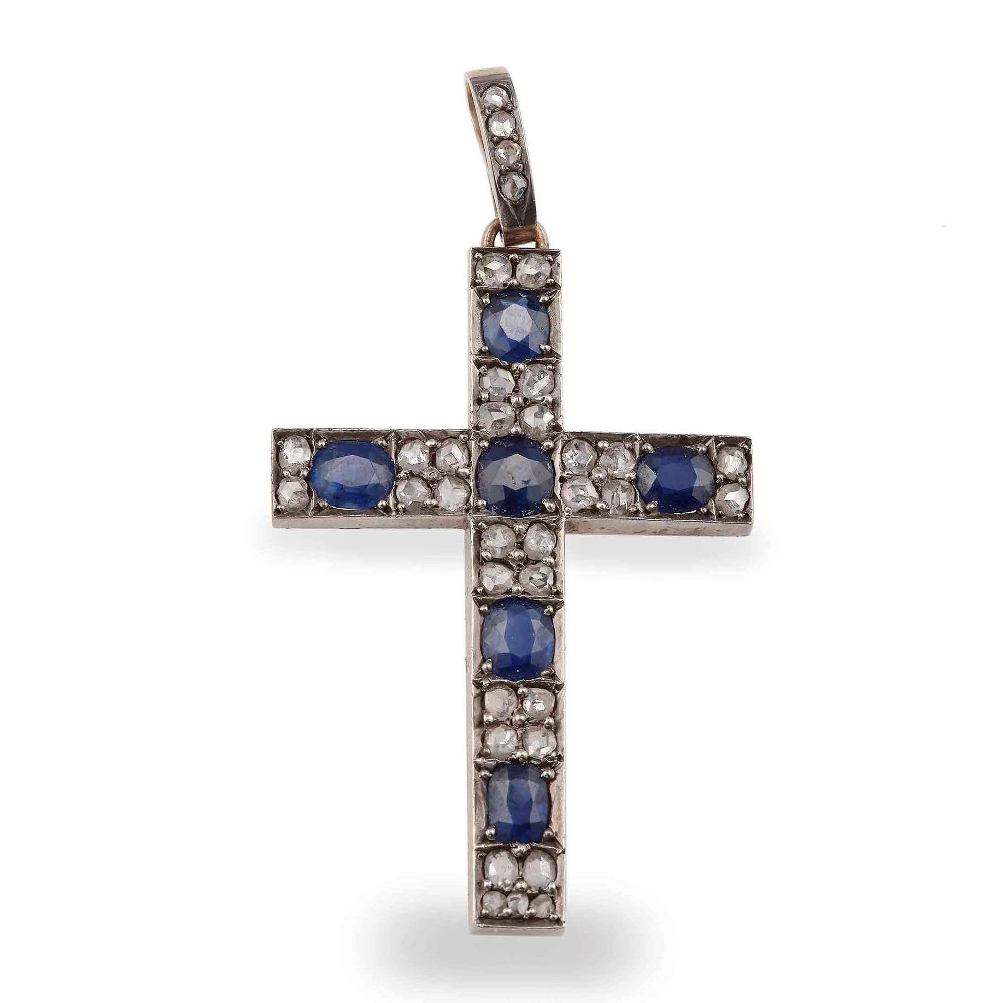 Pendente con zaffiri e rose di diamante, montatura in oro a basso titolo ed argento, gr 8.5, cm 6 x 3