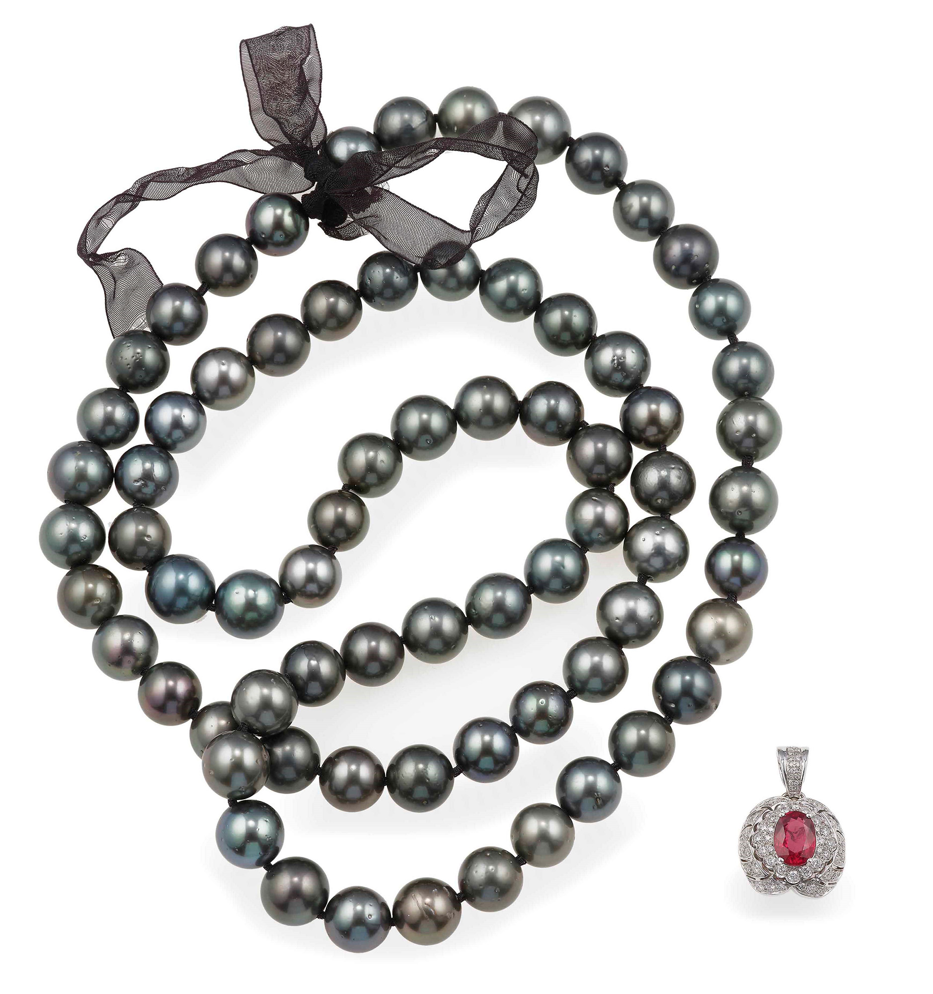 Lungo filo di perle Tahiti ed un pendente con spinello di ct 3.10 circa e diamanti, montatura del pendente in oro bianco 750/1000, collana: gr. 248,8, pendente: gr. 12,1