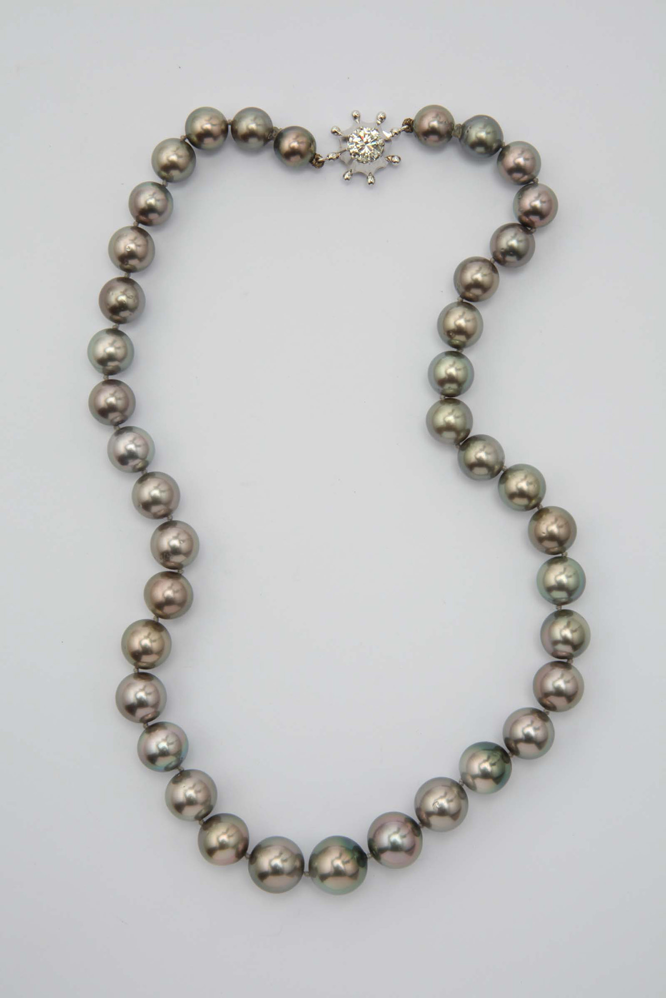 Collana di perle grigie scalari, fermezza in oro bianco 750/1000 con diamante di ct 1.60 circa, , gr 87 , cm 52, perle scalari da mm 9,90 a mm 13,30