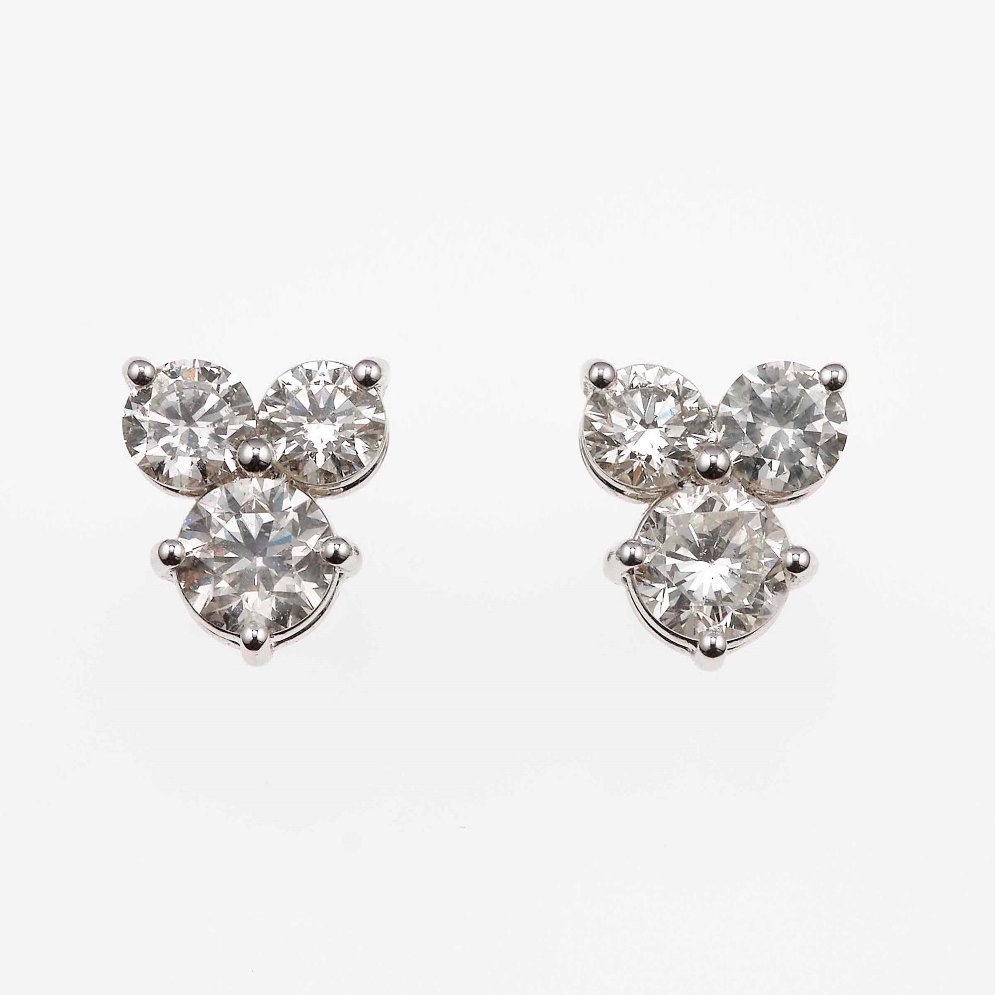 Orecchini con diamanti taglio brillante per ct 2.60 circa totali, montatura in oro bianco 750/1000, gr totali 4,5, cm 1 x 1, purezze SI