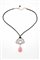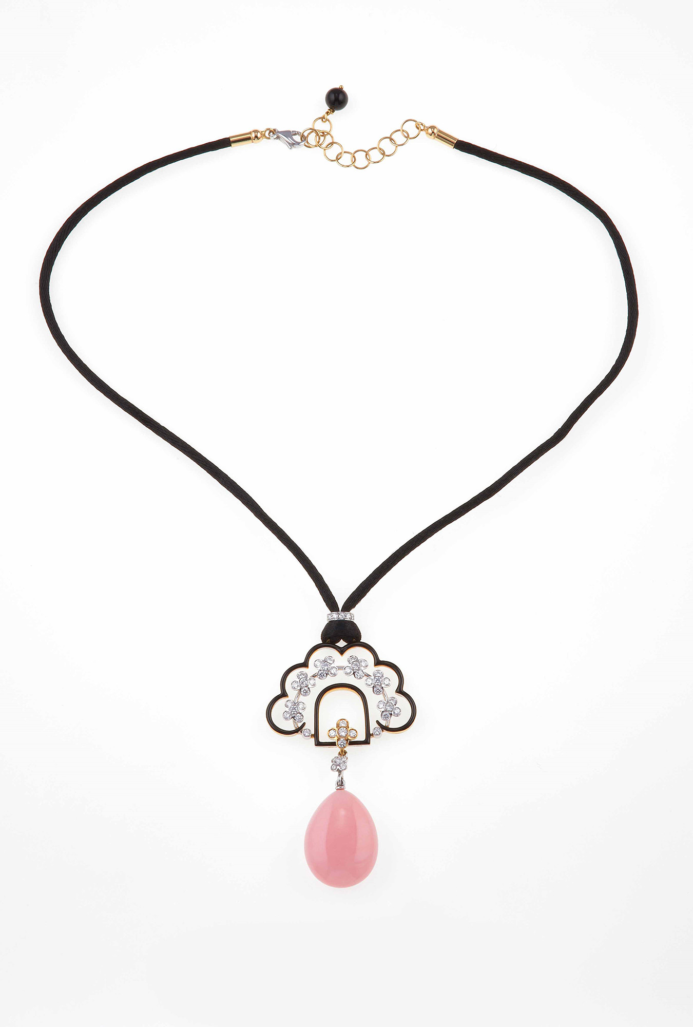 Pendente con opale rosa, diamanti e smalto nero, montatura in oro giallo ed oro bianco 750/1000, gr 18.2, pendente cm 6.5x3.6, firmata G. De Vecchi